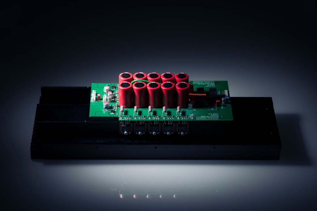 Die symmetrische, verzerrungsarme Schaltung, die auf dem legendären Titan 1000-Watt-Verstärker basiert, verfügt über fünf Paare von Hochleistungsausgangselementen für einen stabilen und zuverlässigen Betrieb. Die separaten Kondensatoren für die Hauptstromversorgung und die Ausgangsgeräte verringern die Ausgangsimpedanz und verbessern die Dynamik. Die extra eingebauten Drosseln verbessern die Restwelligkeit der Versorgung und reduzieren die Impulsstromspitzen.
