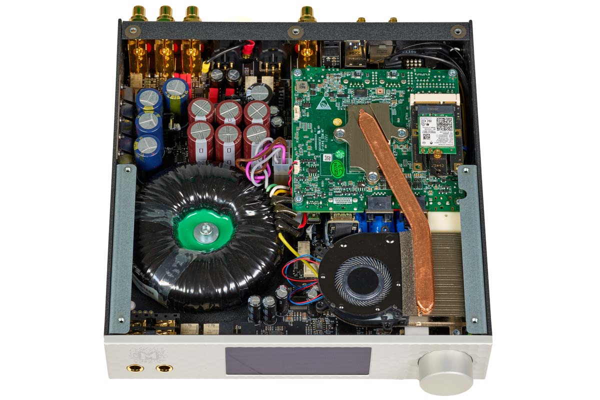 Innendrin ist das Gerät natürlich ein Computer. Der ist mit einem i5-Prozessor ausgestattet und arbeitet mit Linux. Gekühlt wird mit einem Lüfter, dessen Geschwindigkeit sich dreistufig regeln lässt und den man wirklich nicht hört, wenn man sein Ohr nicht unmittelbar ans Gerät hält. Gespeichert wird auf eine SSD mit vier Terabyte, die als wesentlicher Teil des Ready-to-play-Ansatzes der Brooklyn Bridge II im Lieferumfang inkludiert ist. Zum Wandeln kommt ein Chipsatz von ESS zum Einsatz: Der Sabre ES9028PRO, der der ESS-eigenen Hyperstream-II-Architektur folgt und mit 135 Dezibel (mono) einen sehr guten Dynamikumfang hat. Die Filtersektion spricht Mytek über eine eigene Implementierung unter der Bezeichnung „Harmonic Audio Tuning“ an, sodass man zwischen „normal“ und „warm“ wählen kann. Beim Layout des Innenlebens hat Mytek nichts dem Zufall überlassen. „Alle relevanten technischen Komponenten – Wandler, der Class-D-Pre-Amp, Kopfhörerverstärker – sind als separate Sektionen ausgeführt“, betont Dirk Brieden von Audio Trade. „Die Technik ist mittlerweile so weit, dass sich das auf engstem Raum verwirklichen lässt – und zwar highend.“