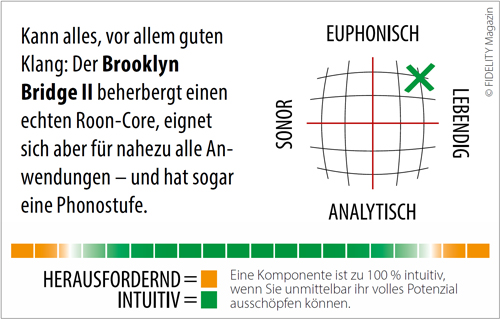 Insgesamt zeigt sich der Brooklyn Bridge ungemein spielfreudig: Er liefert ein vollständiges Klangbild von Tiefbass bis zu schimmerndem „Air“, spielt über die Grundlinie nach vorne und bildet den Raum ortungsscharf dreidimensional ab. Die Dynamik ist, insbesondere in Kombination mit dem Amp+, herausragend und mitunter eine Klasse oberhalb.
