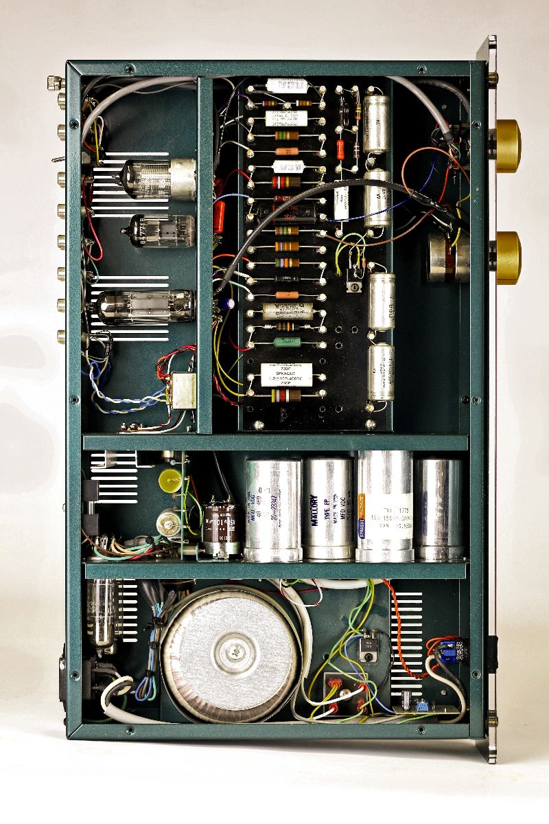 Aus bestimmten Röhrentypen fast eine Religion zu machen war also nicht seine Sache. Im Laufe der Zeit verbaute er Trioden, Pentoden oder sogar Tetroden so­wohl im Single-Ended- als auch im Push-Pull-Betrieb und scheute weder vor Single-Ended-Parallel-Schal­tungen noch vom Einsatz russischer Sendetrioden zurück. Dabei kamen auch unterschiedlichste Topo­logien zum Einsatz – Zwischenübertrager, Eingangsübertrager oder auch simple RC-Kopplung, wobei Vor- oder Phonostufen mit Ausgangsübertragern schon zu einem Zeitpunkt entstanden, an dem kaum sonst jemand auf diese Technik vertraute. Die Verwendung von NOS-Vintage-Bauteilen war übrigens gang und gäbe, aber offensichtlich nicht die Regel. Viele Geräte wurden beispielsweise mit alten Übertragern ausge­stattet, aber zwischendurch kamen ebenso neu ange­fertigte Trafos oder auch aktuelle Widerstandstypen vor. Doch was auf den ersten Blick wie ein Sammelsu­rium erschien, basierte offenkundig auf tiefem Wissen. Wobei niemals grob überdimensionierte Netzteile anzutreffen waren, aber durchaus der eine oder andere Transistor in den Stromversorgungen auftauchte.