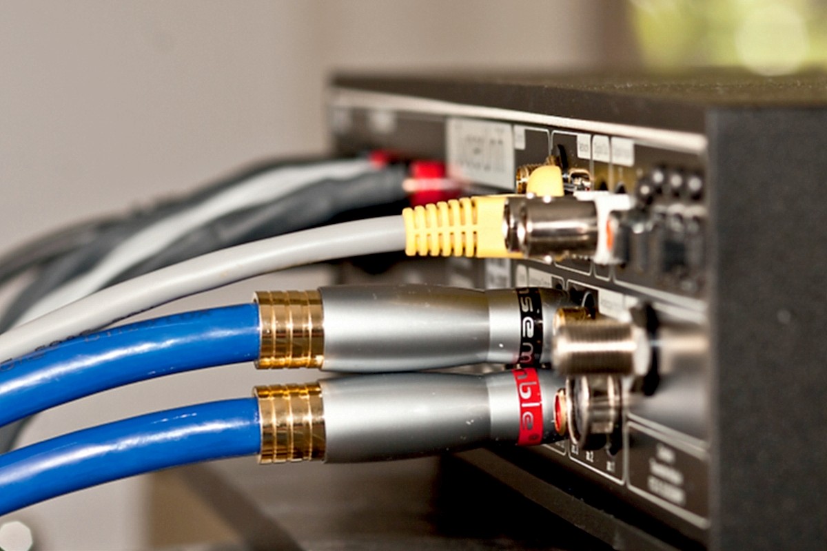 Damit wird die schon erwähnte Sinnsuche deutlich verkürzt: Zum ersten Hören bleibt der SuperUniti nun doch an meiner Anlage im Musikzimmer, findet seinen Platz auf der obersten Ebene des Phonosophie-Racks und wird zunächst nur über den Router (LAN) mit dem Musikarchiv auf dem NAS verbunden. Da ich einen gewissen Respekt (und auch ein gerüttelt Maß an Unverstand) gegenüber Computerdingen mitbringe, freue ich mich über die beiliegende Quick-Start-Anleitung, deren Schritte auch für mich leicht nachvollziehbar sind und auf Anhieb funktionieren. Es dauert ganze drei Minuten, und der Naim ist mit dem heimischen Netzwerk verbunden, hat das NAS erkannt und will loslegen. Erfreut nehme ich auch zur Kenntnis, dass am beiliegenden Netzkabel die Phase markiert wurde. Sie ahnen nicht, bei wie vielen auch höchstpreisigen Geräten man mit dem Multimeter hinter der Anlage herumkriechen muss, weil Hersteller und/oder Vertrieb auf diesen klanglich bedeutsamen Aspekt nicht geachtet haben. Fragwürdig hingegen finde ich den sehr geringen Abstand der Cinchbuchsen zueinander. Kabel mit dickeren Steckern können da schon mal sperren, wie ein Bild zum Abschluss dieser Story zeigt.