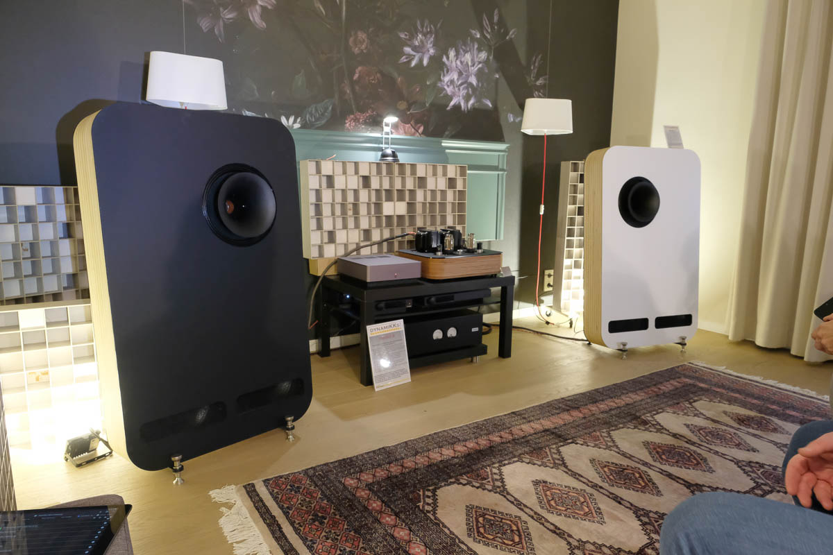 Den vielleicht dicksten Show-Stopper hatte derweil Ulf Moning im Handgepäck (oder eher auf dem Hubwagen). Mit der Menhir A zeigte Dynamikks! eine taufrische Standbox. Auf den ersten Blick könnte man die Menhir für eine offene Schallwand halten, was aber nicht ganz richtig ist. Im Mittel-Hochton kommt ein gemischter Dipol-/Koaxtreiber mit einem Tweeter in Druckkammertechnik zum Einsatz. Das komplexe Konstrukt ragt tatsächlich am Rücken aus der Gehäusewand. Weiter unten sind allerdings zwei Woofer verbaut, die mit dem Volumen der schmalen Box arbeiten. Angetrieben wurde die phänomenal aufspielende A von einem UM-Labs-Verstärker, den Ulf Moning optisch passend zu den Vorführmustern gestaltet hatte. Um die Kette in einem Wort zusammenzufassen müssen Sie sich nur den Markennamen vergegenwärtigen: Dynamikks!