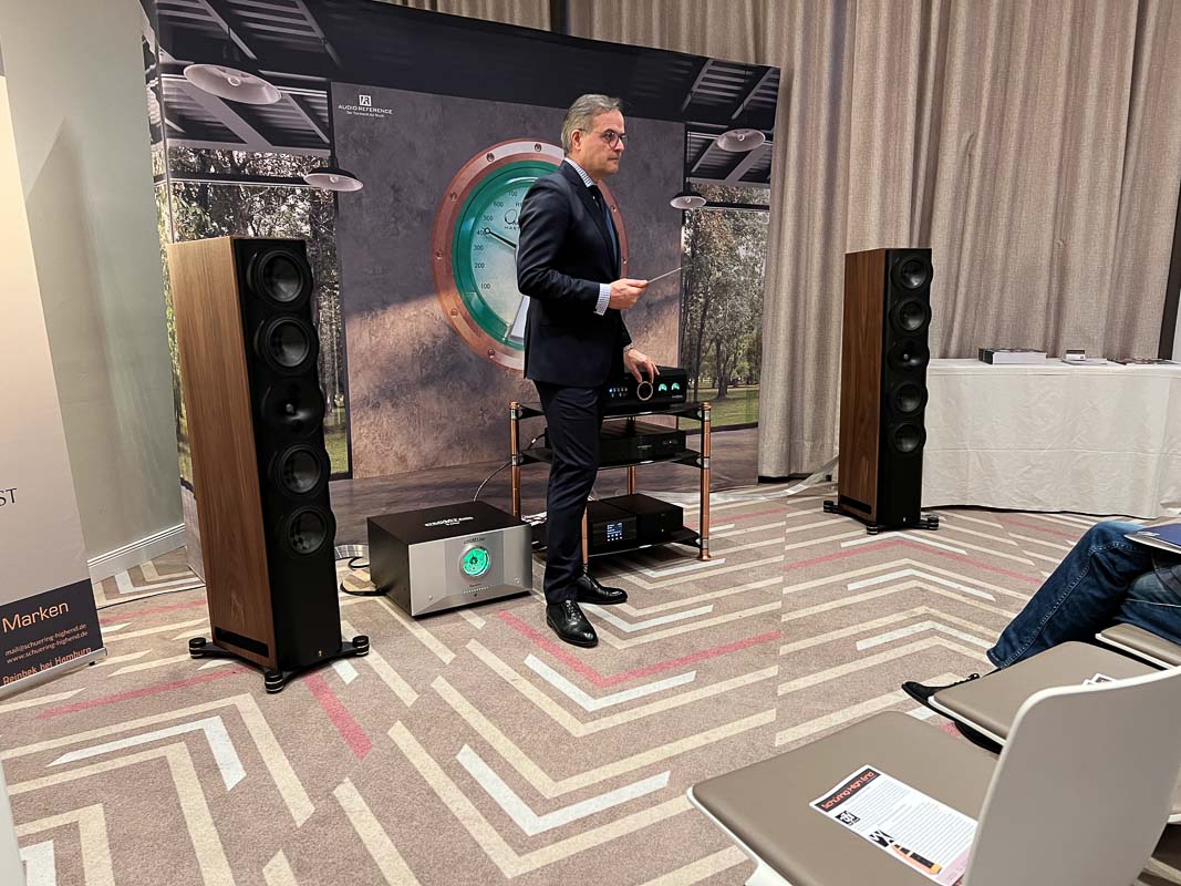 Hinzu kommt, dass sich viele Aussteller nicht aufs „plumpe“ Präsentieren (sprich: Spielen) ihrer Anlagen beschränkten. Der IAD-Vertrieb etwa veranstaltete im Stundentakt Workshops oder ließ norddeutsche Händler zu Wort kommen, die von ihren Erfahrungen mit Marken wie Soulnote oder Lumin berichteten. Eine Etage tiefer führte Audio-Reference-Chef Mansour Mamaghani die Besucher seines großen Salons persönlich in die Finessen der beiden Vorführketten ein. Die eine basierte auf solider Kost von Perlisten und Krell, die zweite auf Wilson Audio, D’Agostino, dCS und weiteren Kostbarkeiten.