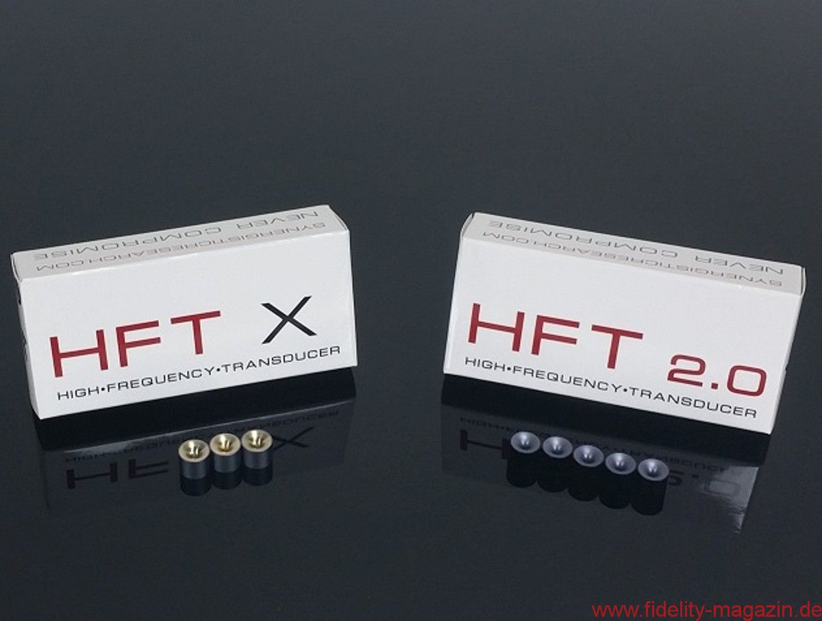 Ebenfalls gibt es die HFT (High Frequency Transducer), kleine Punkte, die im Raum an Decken und Wänden verteilt werden, neben der Standardversion HFT (5er Set für 330,- €) jetzt auch als HFT2,0 (5er Set 330,- €), welche mehr für eine bessere Mittenwiedergabe (etwas wärmer als die normalen HFTs konzipiert wurde, und HFT X (3er Set für 330,- €), welche für mehr Details und Auflösung entwickelt wurden.