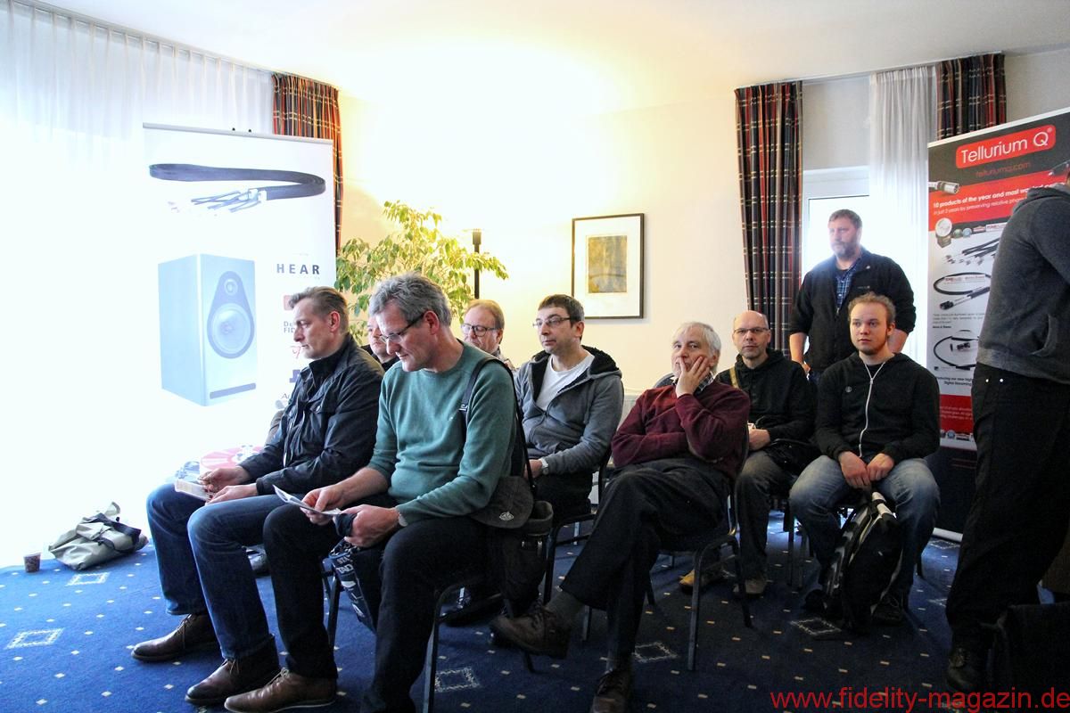 Zu absoluten Spitzenzeiten drängten sich die Besucher dann derart in manchen Räumen, dass manche nur kurz den Kopf in den Eingangsbereich der Hotelzimmer und -suiten steckten, was für das wahre Klangerlebnis ziemlich sinnlos ist. Andere „schafften“ es immerhin bis zum nächsten Türrahmen, was die Sache mit dem guten Klang aber auch nicht wirklich besser machte. Nur konsequent daher der handschriftliche Hinweis bei Sieveking Sound: „Im Türrahmen klingt es mies!“ Wer sich daraufhin einen Platz auf den aufgestellten Stühlen verschaffte, konnte der Aussage nur zustimmen, denn im Raum selbst klangen die Verity Finn, angesteuert von Esoteric und Audia Flight, wirklich gut.