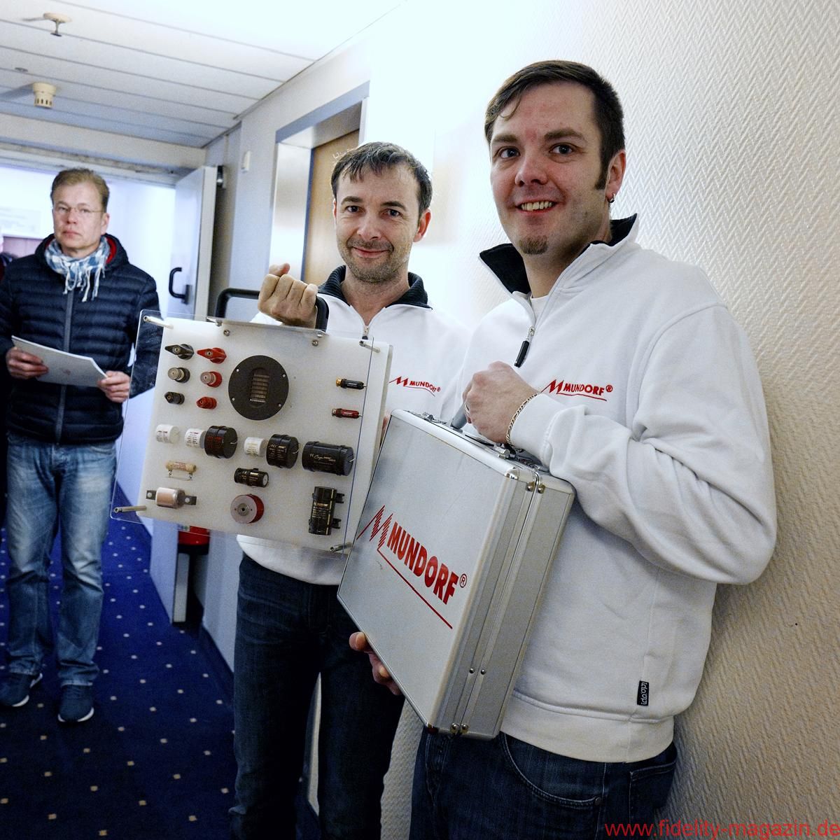 In puncto Neuigkeiten hatten sich einige Aussteller ordentlich ins Zeug gelegt. Weltpremiere feierten auf den Norddeutschen HiFi-Tagen beispielsweise die neuen kleinen Verstärker von PS Audio (je um 2000€), die per Eilkurier direkt aus USA gekommen waren. Die Jungs von Lyravox hatten hingegen Heimspiel und zogen mit „Karl“ und „Karlotta“, zwei vollaktiven Streaming-Lautsprechern im Vollformat, ins Holiday Inn ein. Das High Fidelity Studio aus Augsburg präsentierte den kleinen, preisgünstigen „Licht-Tonabnehmer“ 002 von DS Audio für 5500€ sowie einige Plattenspieler, Systeme und Phonoentzerrer (designed by Tim de Paravicini) von Mobile Fidelity – und natürlich das AMG-Portfolio in voller Pracht. Gryphon zeigte endlich den „kleinen“ Vollverstärker Diablo 120 bei TAD. Dort sorgte auch Tannoys jüngst erfrischte GR-Modellpalette für Aufsehen – und die Unison Max 2 für substanziellen, knackigen Sound. Burmester war mit dem neuen, wunderbar aufspielenden Lautsprecher B18, angereist. Die komplette kleine Anlage bei ELAC kostete sogar nur 2500 Euro und verbreitete gute Laune. Und dann: Ballfinger! Der Designer Roland Schneider – der zuvor mit namhaften Uhrenherstellern ans Licht der Öffentlichkeit getreten war – sorgte ausgerechnet mit einer neu entwickelten Tonbandmaschine für feuchte Augen bei Nostalgikern und Ästheten. Die 28000 Euro teure Open-Reel-Maschine zog sofort alle Blicke auf sich, doch auch Ballfingers Prototypen eines kommenden Plattenspielers (8800 Euro inklusive kombiniertem Dreh-Tangentialarm) sowie eines passenden Vorverstärkers ließen willkommene Einflüsse moderner HiFi-Klassiker von Dieter Rams oder auch Bang&Olufsen erkennen. Wir kehrten mehrfach zu den Ballfinger-Pretiosen zurück und konnten uns nur schwer wieder von den drei Schönheiten losreißen.