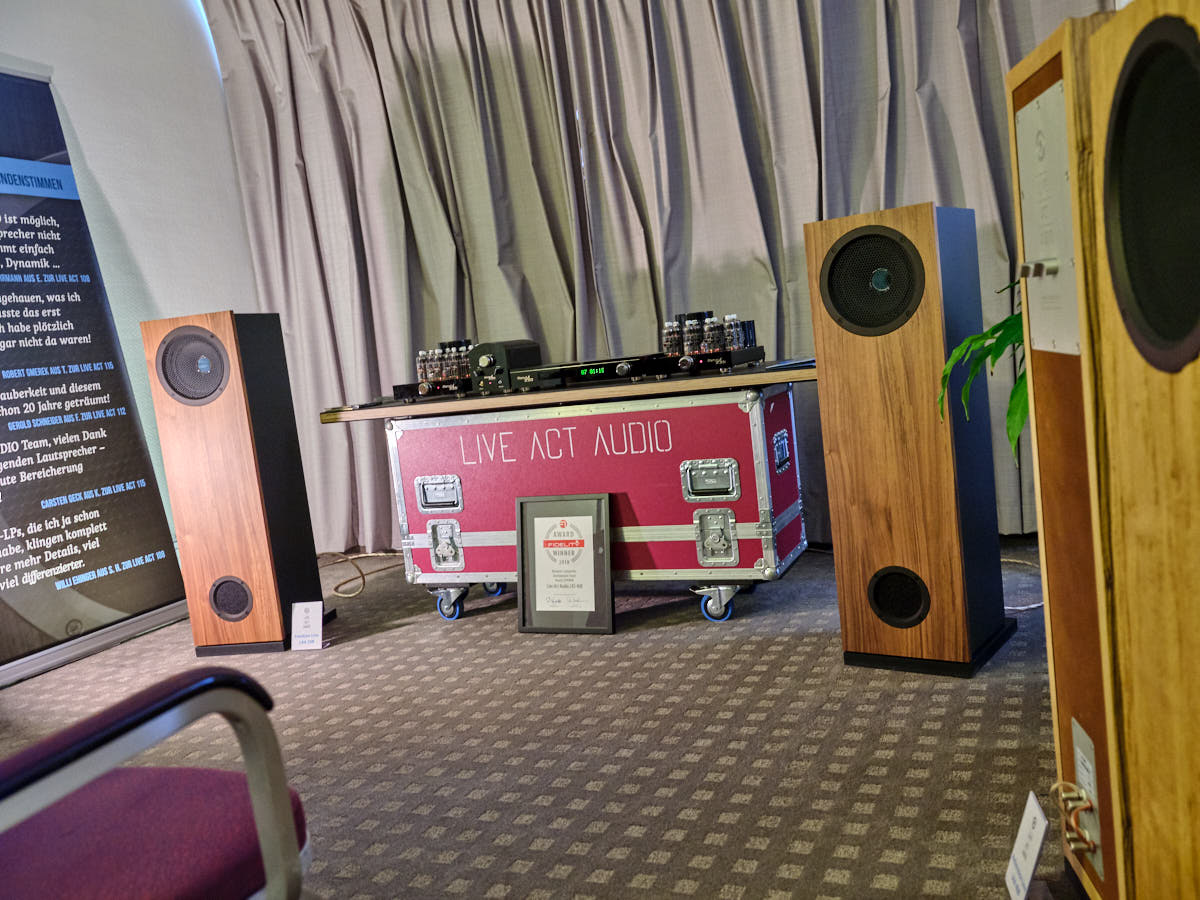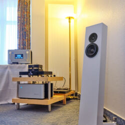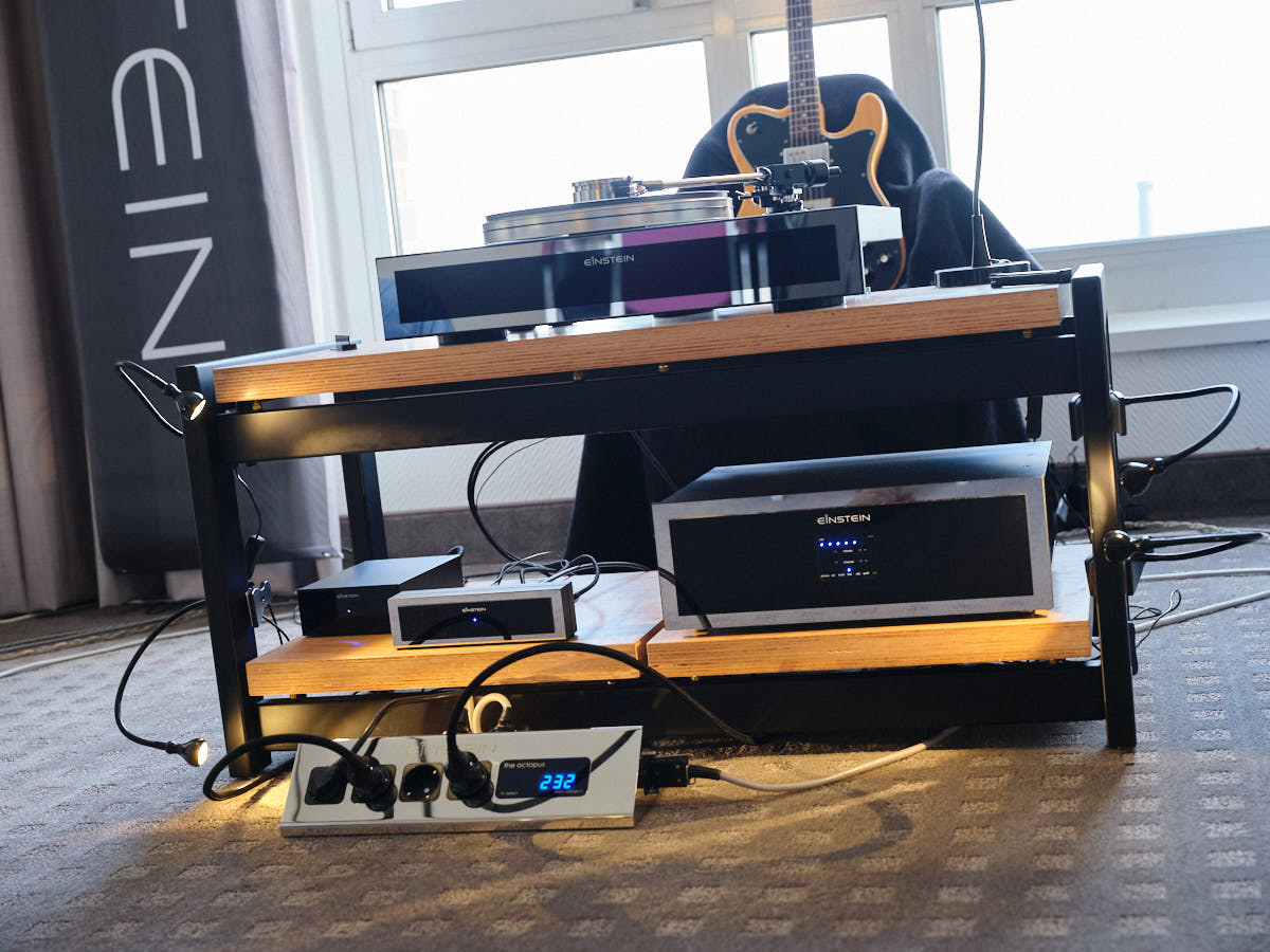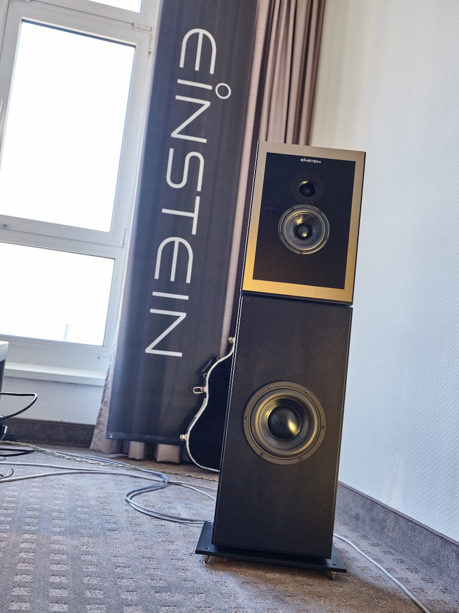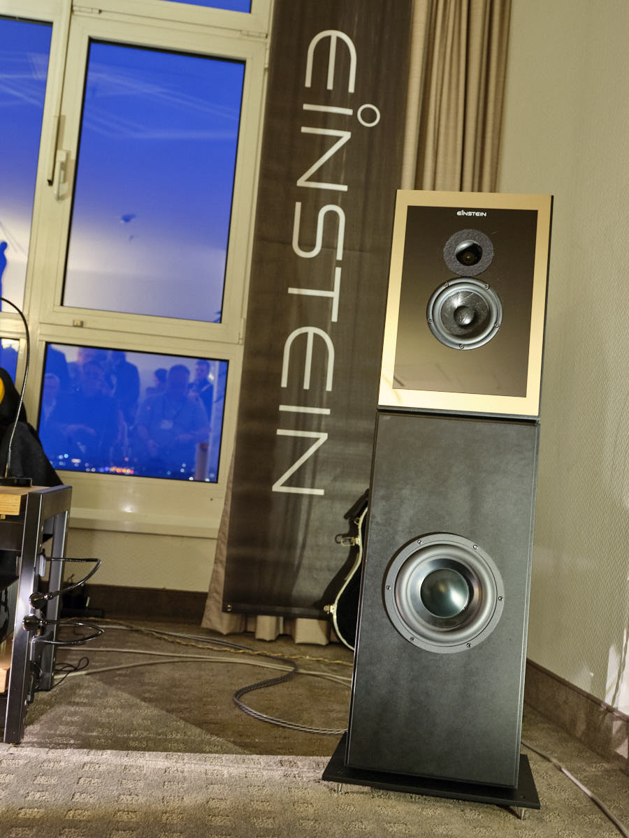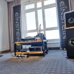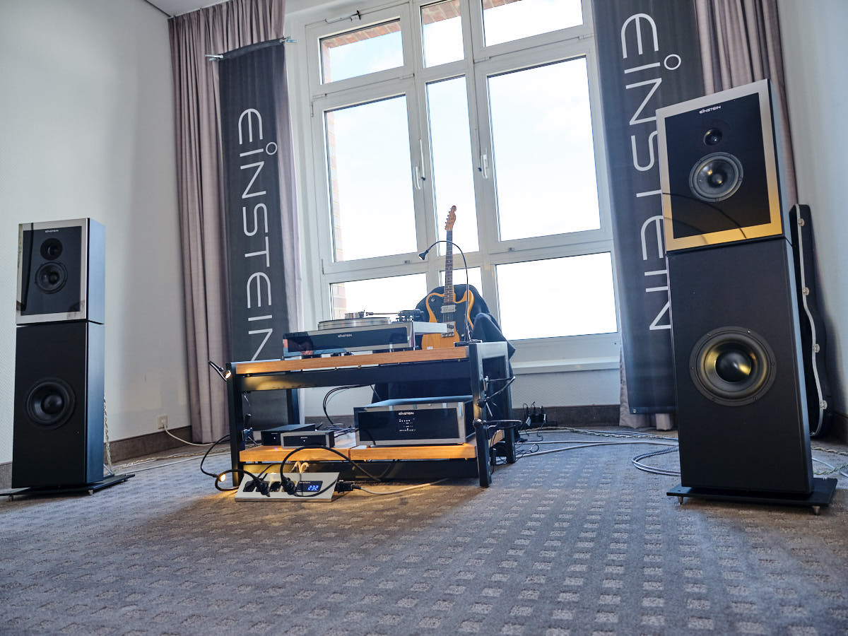 „Sich einfach treiben lassen“ … daran muss ich im Nachhinein immer wieder denken und bin zugegebenermaßen etwas neidisch auf die beiden Herren. Kaum oben angekommen stürzte ich mich auf die ersten beiden Gänge und führte eilige Gespräche mit den Ausstellern. DALI, Mudra sowie Fischer&Fischer, hORNS, Cambridge Audio, Elac, Quadral, Scheu, Dr. Feickert, Manger, Esoteric, Input Audio und viele mehr fand ich auf den drei obersten Etagen des Wohnturms. Hören konnte ich hier und dort auch etwas. Besonders blieb mir die exquisite Vorführung bei Einstein im Gedächtnis – und das nicht nur wegen der prominent hinter dem Rack platzierten bildschönen Fender Telecaster. Ebenfalls zum Verweilen lud die gewohnt professionell moderierte Präsentation von Eternal Arts. Hier gab es die klangvollen Röhrenmonos OTL Mono-Bloc an Lautsprechern von Live Act Audio.