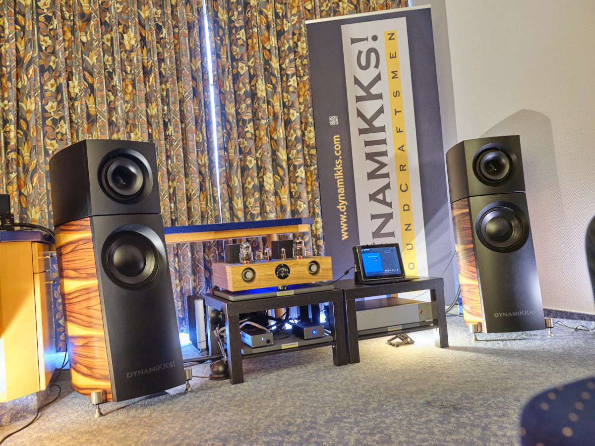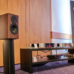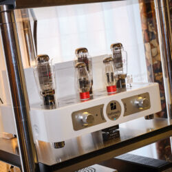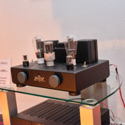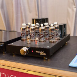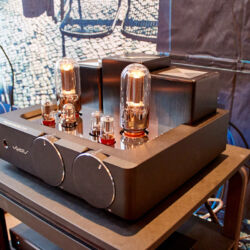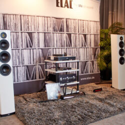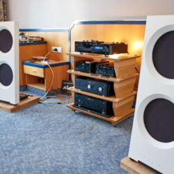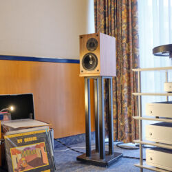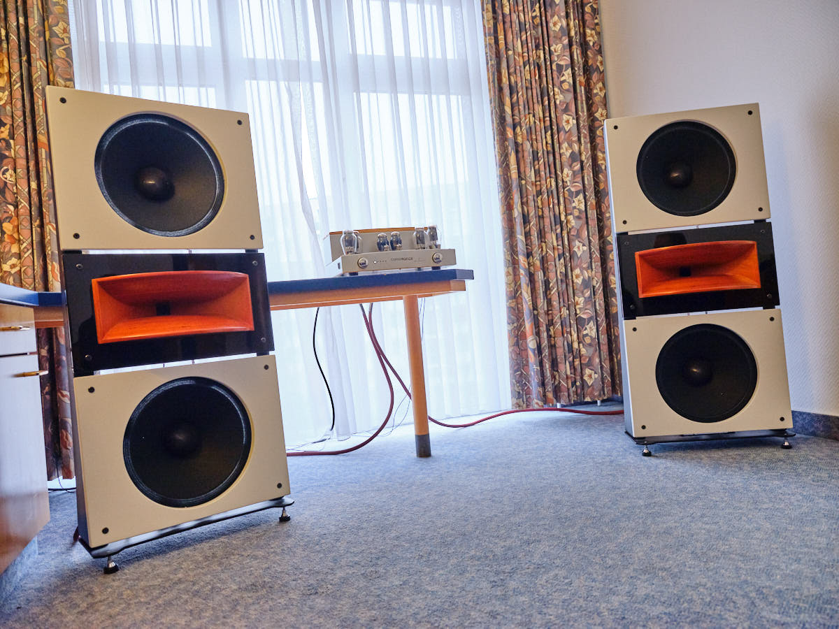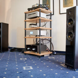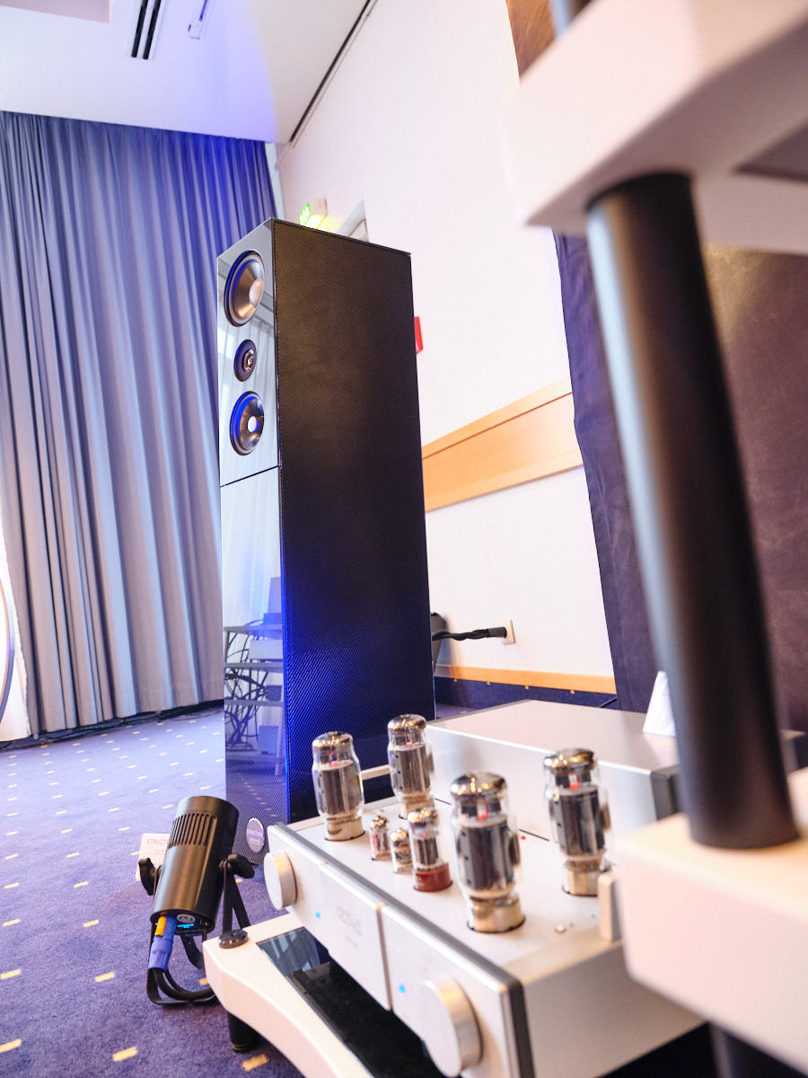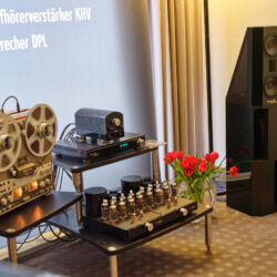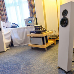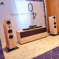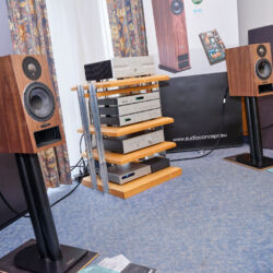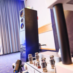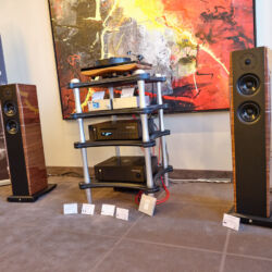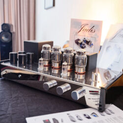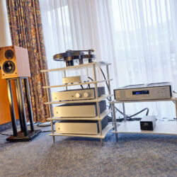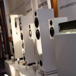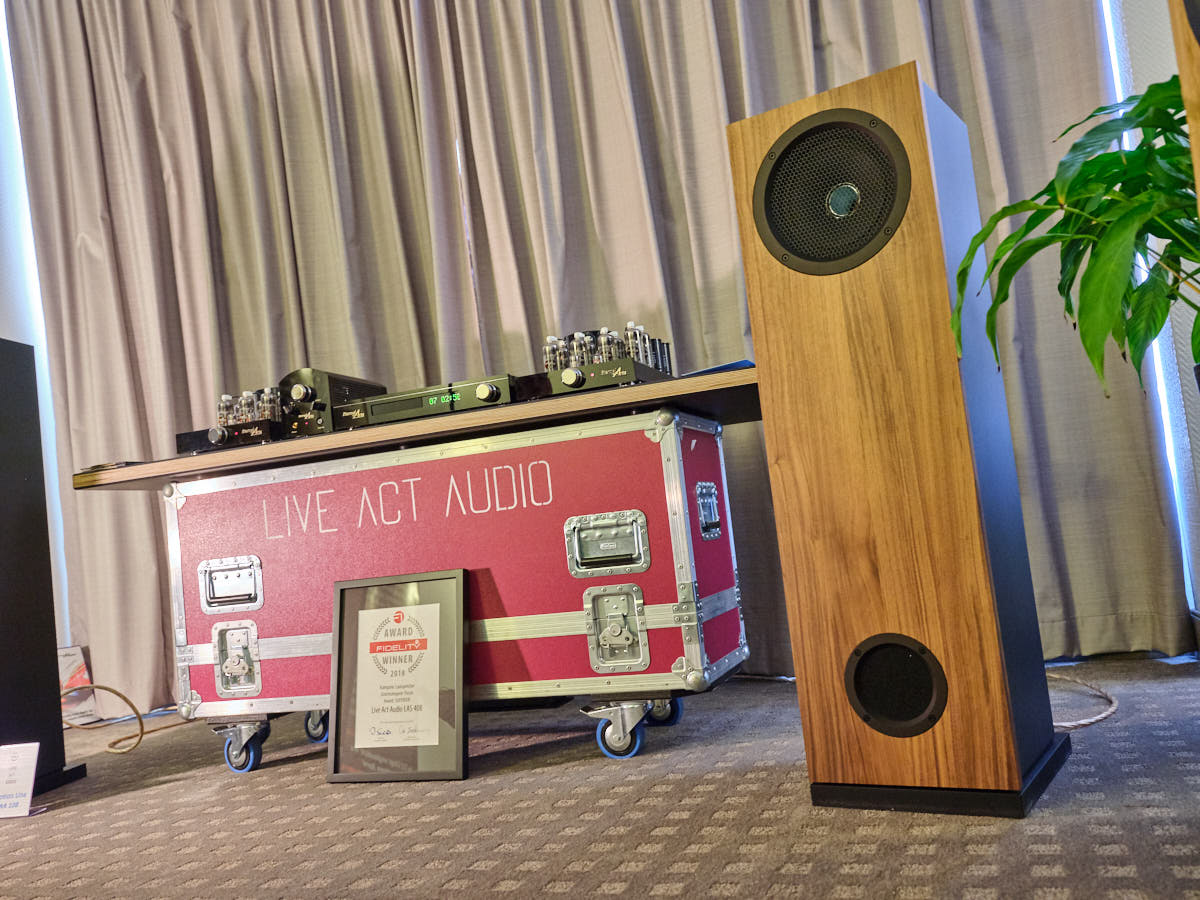 „Sich einfach treiben lassen“ … daran muss ich im Nachhinein immer wieder denken und bin zugegebenermaßen etwas neidisch auf die beiden Herren. Kaum oben angekommen stürzte ich mich auf die ersten beiden Gänge und führte eilige Gespräche mit den Ausstellern. DALI, Mudra sowie Fischer&Fischer, hORNS, Cambridge Audio, Elac, Quadral, Scheu, Dr. Feickert, Manger, Esoteric, Input Audio und viele mehr fand ich auf den drei obersten Etagen des Wohnturms. Hören konnte ich hier und dort auch etwas. Besonders blieb mir die exquisite Vorführung bei Einstein im Gedächtnis – und das nicht nur wegen der prominent hinter dem Rack platzierten bildschönen Fender Telecaster. Ebenfalls zum Verweilen lud die gewohnt professionell moderierte Präsentation von Eternal Arts. Hier gab es die klangvollen Röhrenmonos OTL Mono-Bloc an Lautsprechern von Live Act Audio.