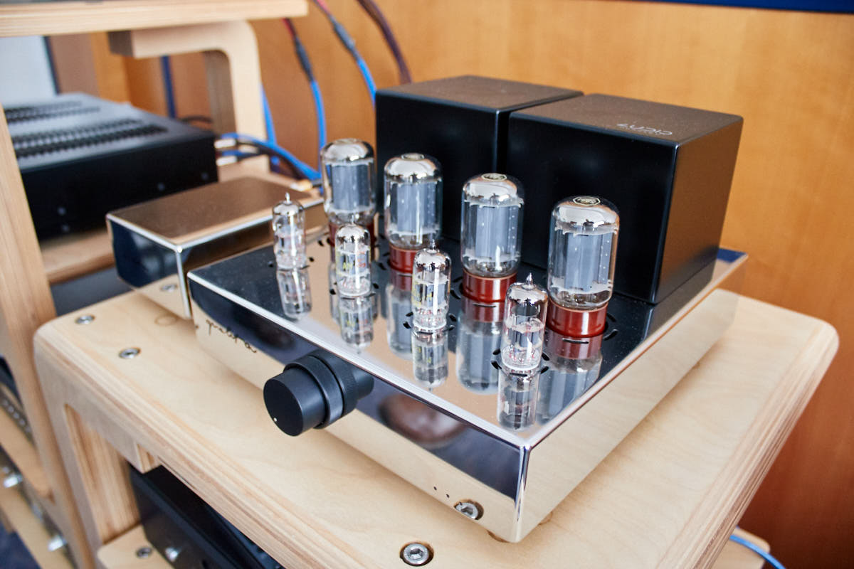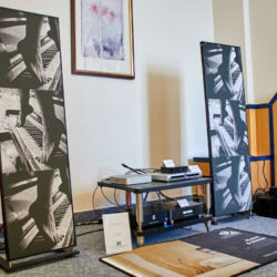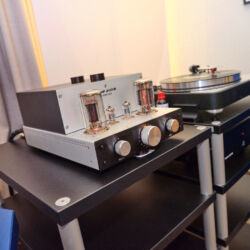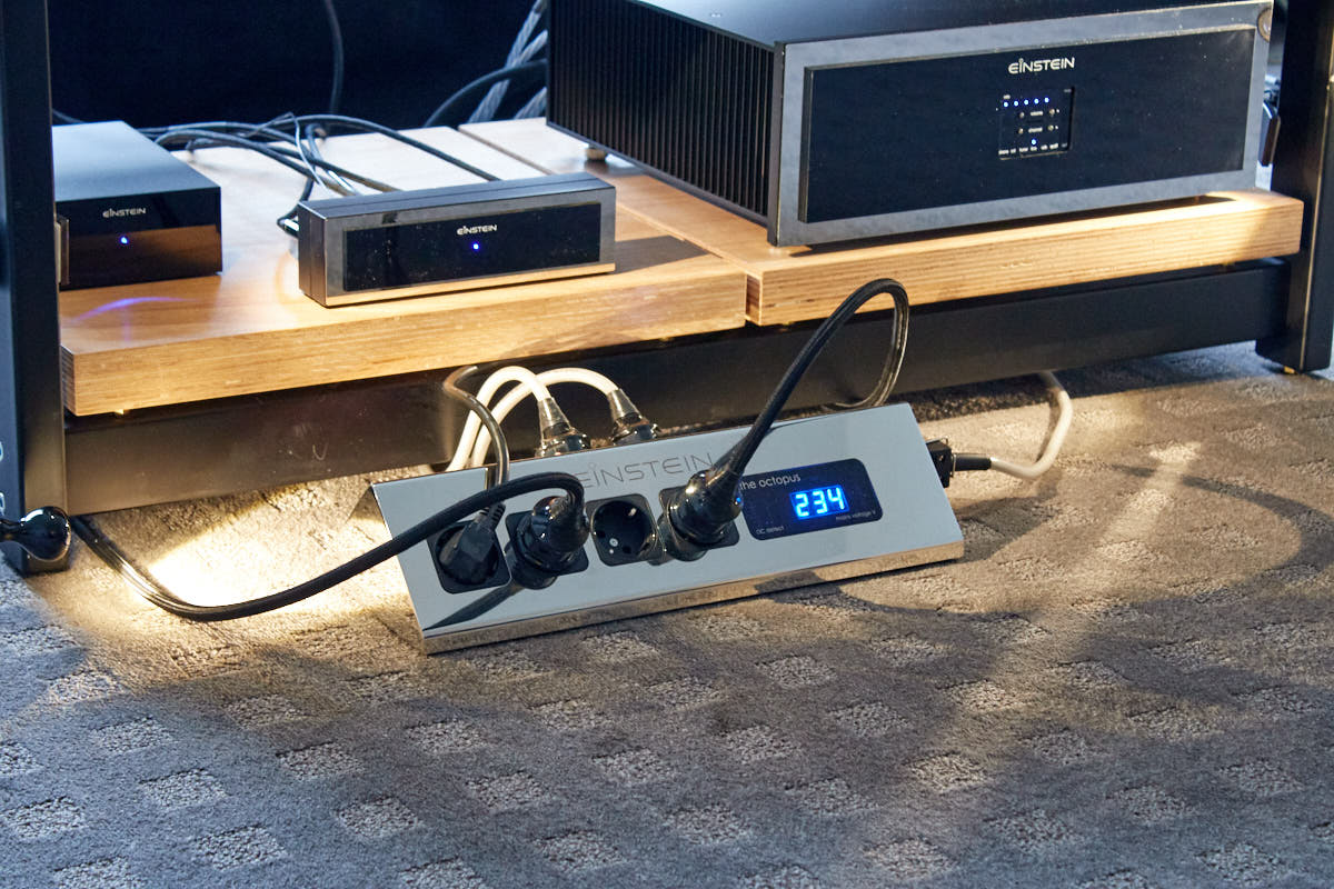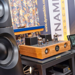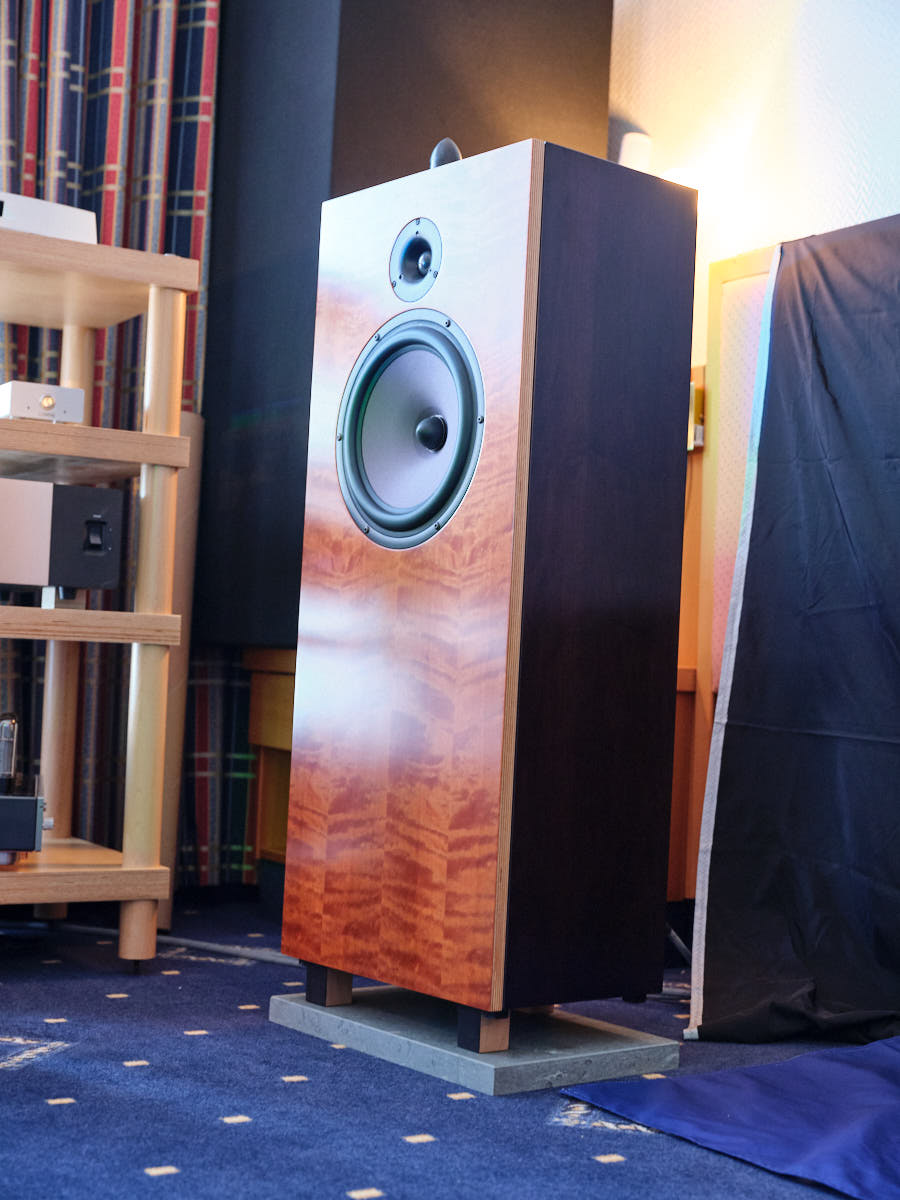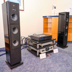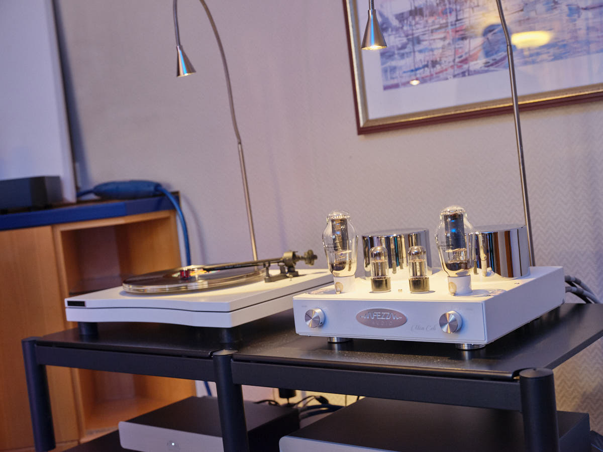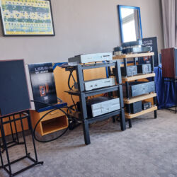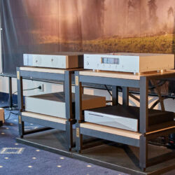 „Sich einfach treiben lassen“ … daran muss ich im Nachhinein immer wieder denken und bin zugegebenermaßen etwas neidisch auf die beiden Herren. Kaum oben angekommen stürzte ich mich auf die ersten beiden Gänge und führte eilige Gespräche mit den Ausstellern. DALI, Mudra sowie Fischer&Fischer, hORNS, Cambridge Audio, Elac, Quadral, Scheu, Dr. Feickert, Manger, Esoteric, Input Audio und viele mehr fand ich auf den drei obersten Etagen des Wohnturms. Hören konnte ich hier und dort auch etwas. Besonders blieb mir die exquisite Vorführung bei Einstein im Gedächtnis – und das nicht nur wegen der prominent hinter dem Rack platzierten bildschönen Fender Telecaster. Ebenfalls zum Verweilen lud die gewohnt professionell moderierte Präsentation von Eternal Arts. Hier gab es die klangvollen Röhrenmonos OTL Mono-Bloc an Lautsprechern von Live Act Audio.