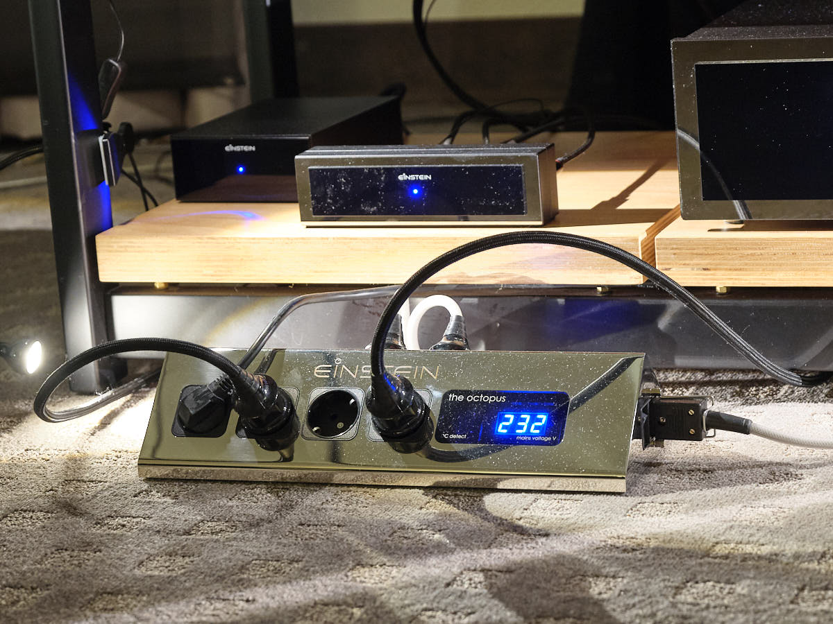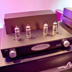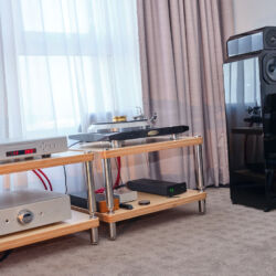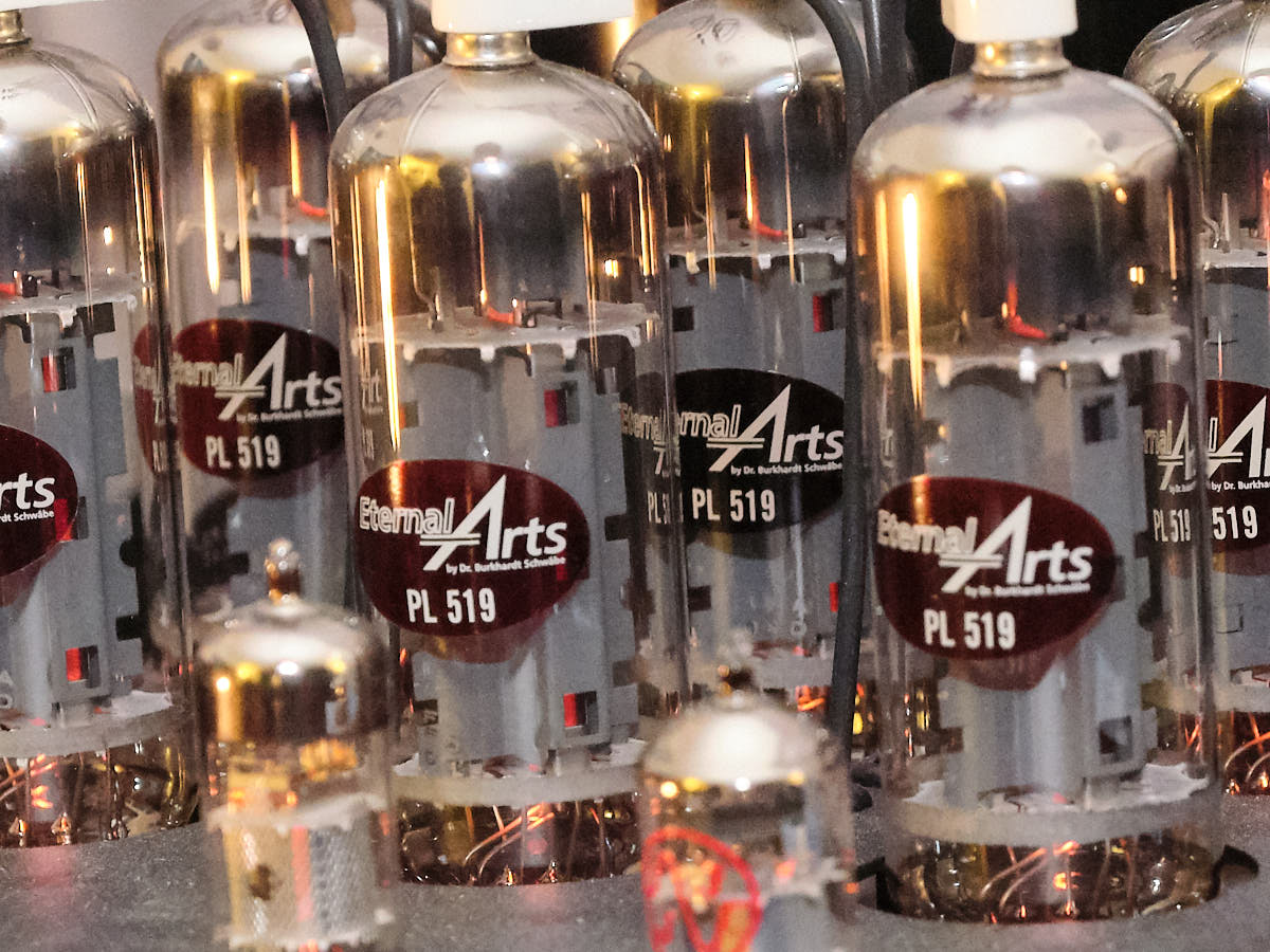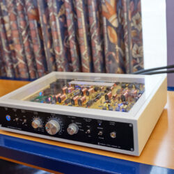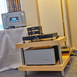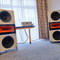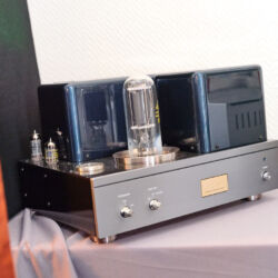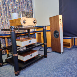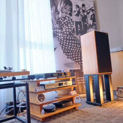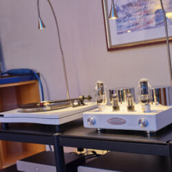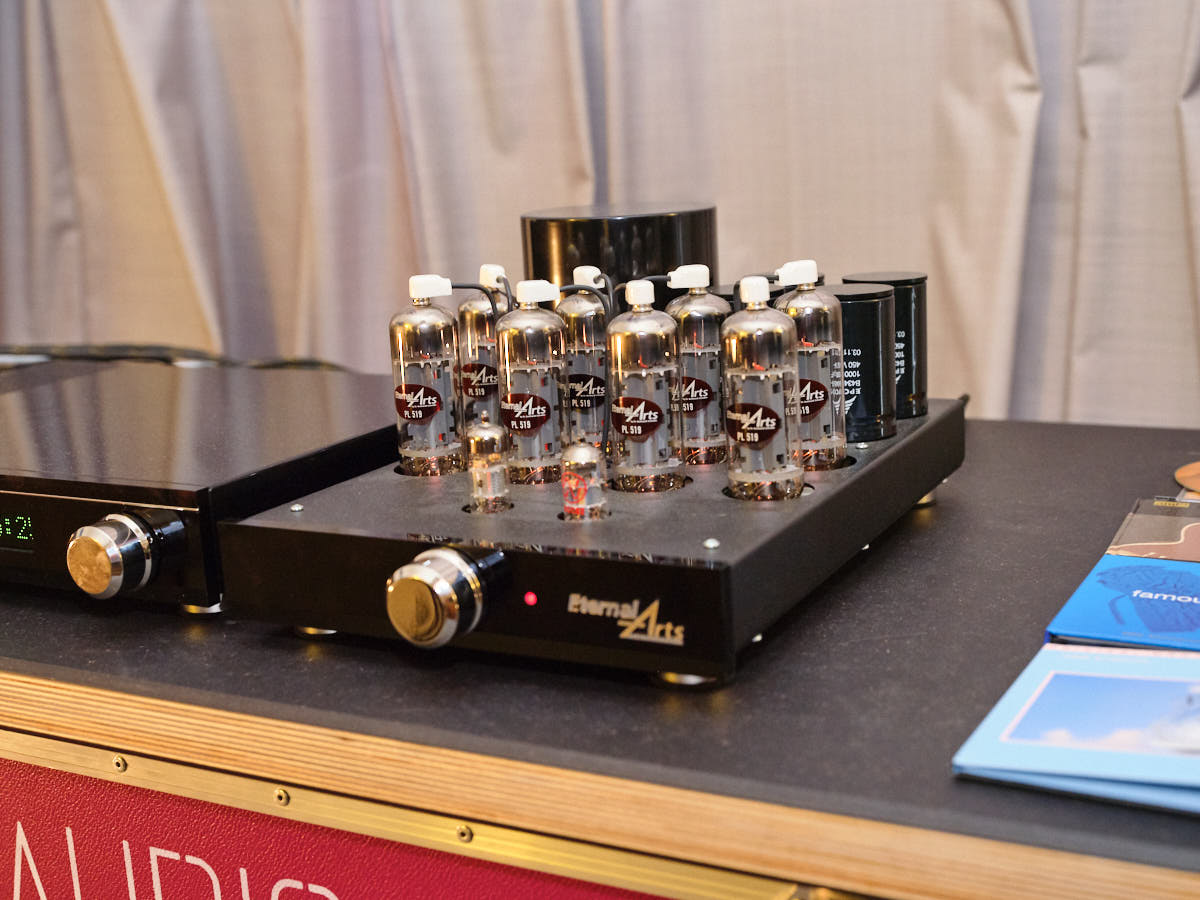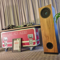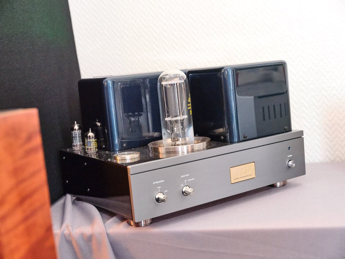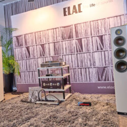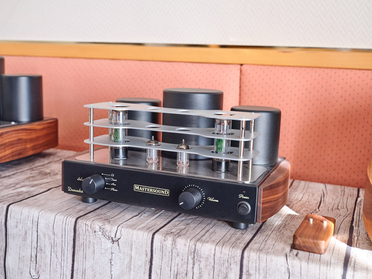 „Sich einfach treiben lassen“ … daran muss ich im Nachhinein immer wieder denken und bin zugegebenermaßen etwas neidisch auf die beiden Herren. Kaum oben angekommen stürzte ich mich auf die ersten beiden Gänge und führte eilige Gespräche mit den Ausstellern. DALI, Mudra sowie Fischer&Fischer, hORNS, Cambridge Audio, Elac, Quadral, Scheu, Dr. Feickert, Manger, Esoteric, Input Audio und viele mehr fand ich auf den drei obersten Etagen des Wohnturms. Hören konnte ich hier und dort auch etwas. Besonders blieb mir die exquisite Vorführung bei Einstein im Gedächtnis – und das nicht nur wegen der prominent hinter dem Rack platzierten bildschönen Fender Telecaster. Ebenfalls zum Verweilen lud die gewohnt professionell moderierte Präsentation von Eternal Arts. Hier gab es die klangvollen Röhrenmonos OTL Mono-Bloc an Lautsprechern von Live Act Audio.