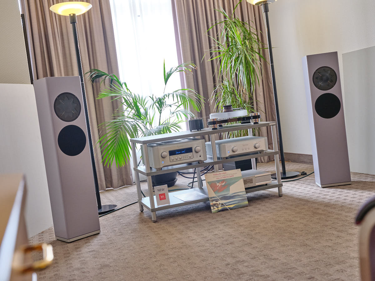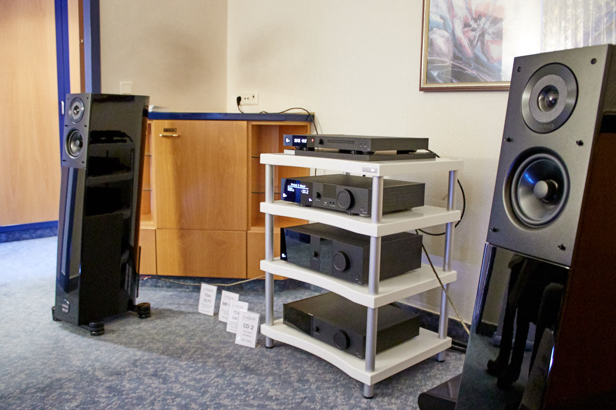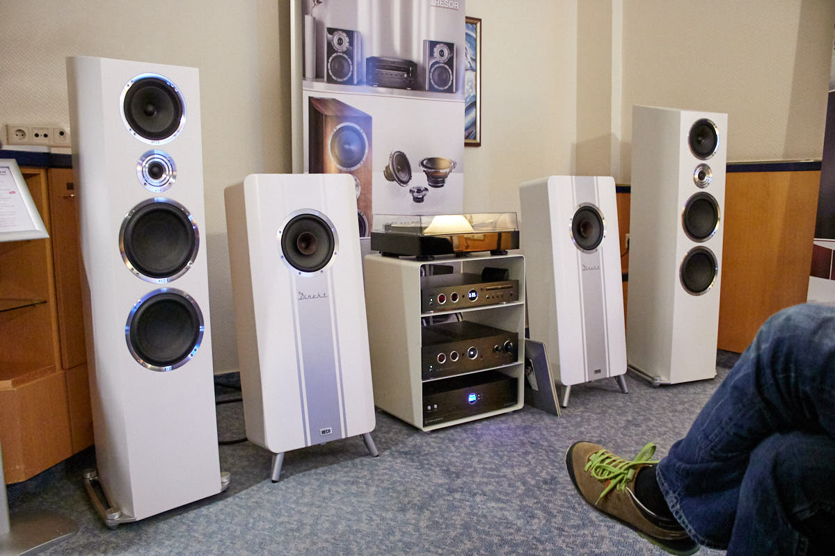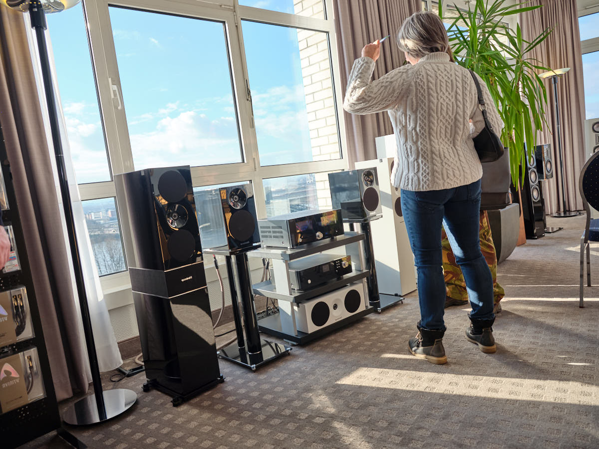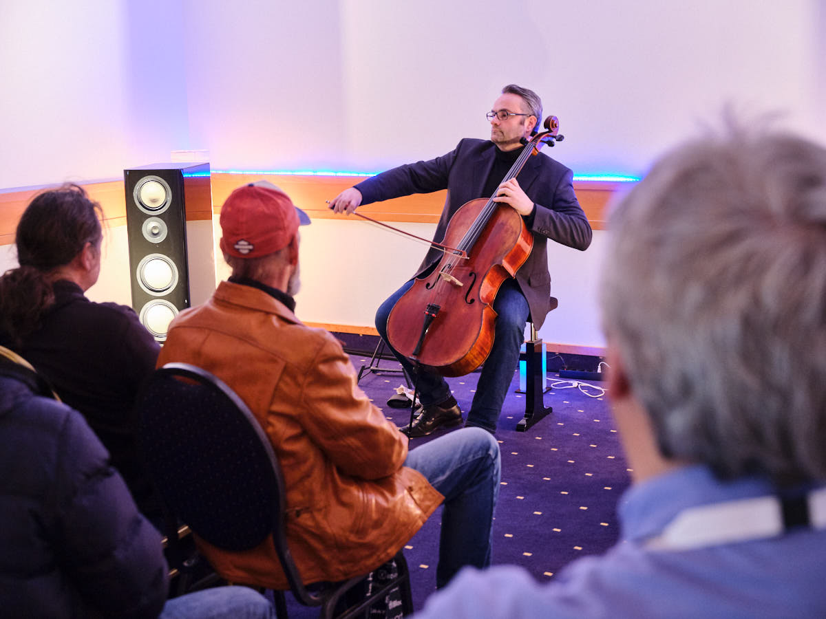 Der erste Besucherstrom verschwanden zielstrebig in die Vorführräume der großen Säle des ersten und zweiten Stockwerks. Hier gastierten neben B&W Marken wie Musical Fidelity, Triangle, Burmester, FinkTeam, IsoTek, Audio Physic und X-Odos, T+A oder Naim und Focal und natürlich Dynaudio. Wer als Aussteller einmal einen dieser exklusiven Räume ergattert hat, hält daran fest und so wissen die Wiederholungstäter unter den Besuchern ganz genau, welche Vorführungen sich besonders lohnen. Die Hörqualität in den großen Salons war durchweg gut bis exzellent. Eine ganz besondere Performance hatten sich Canton und Phonosophie einfallen lassen: In ihrem Gemeinschaftsraum gab es abwechselnd Cello-Livekonzerte gefolgt von hervorragender Retortenmusik.