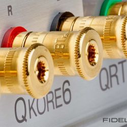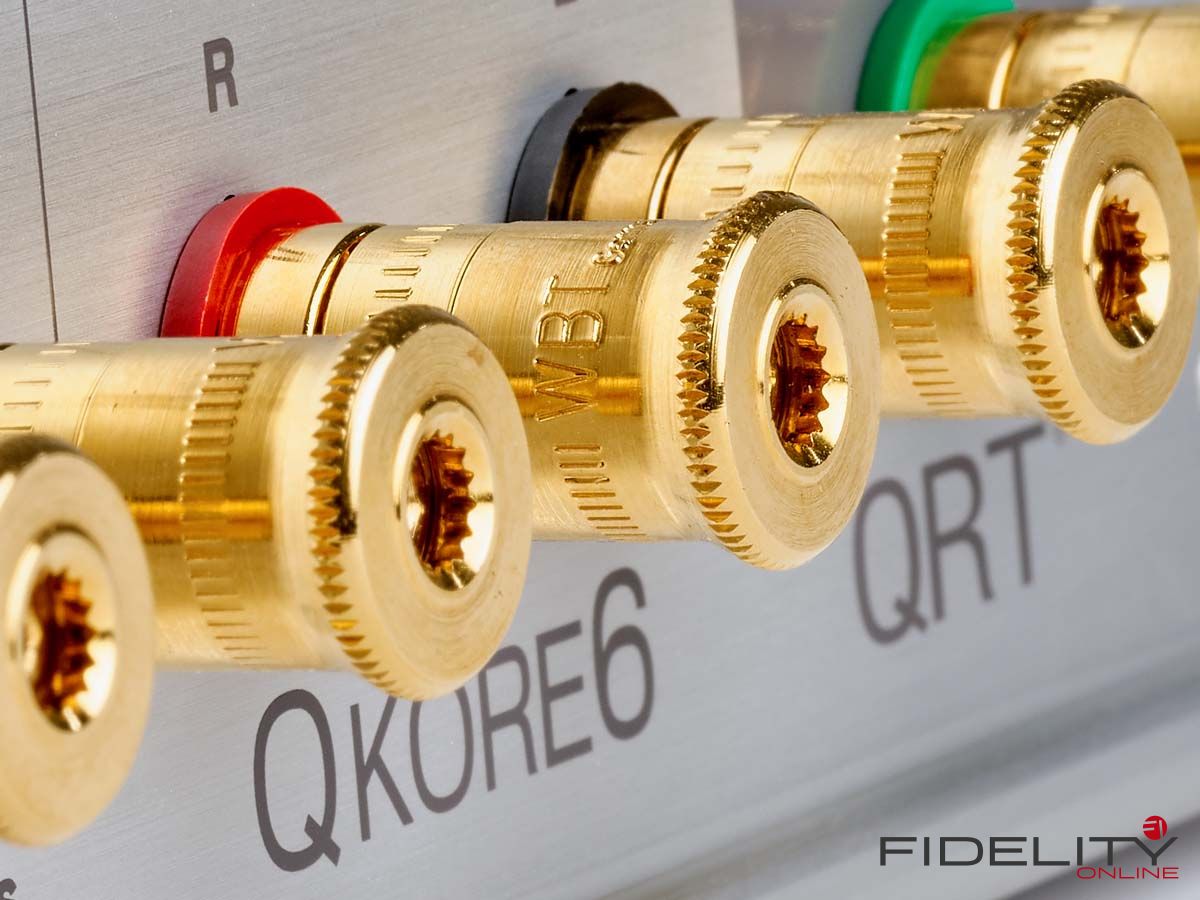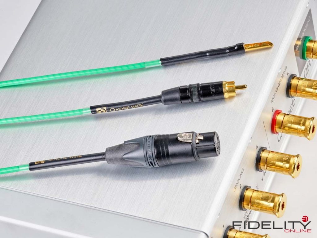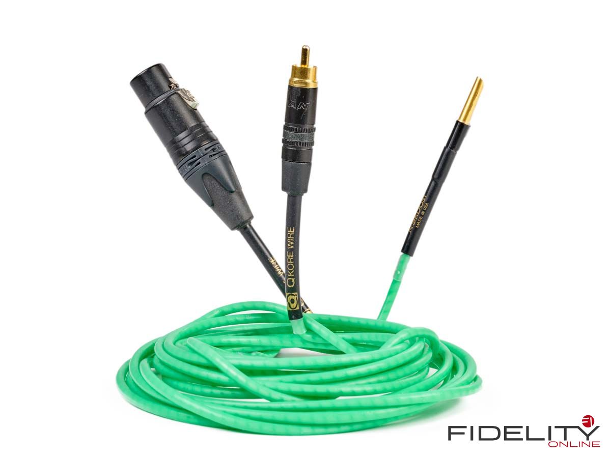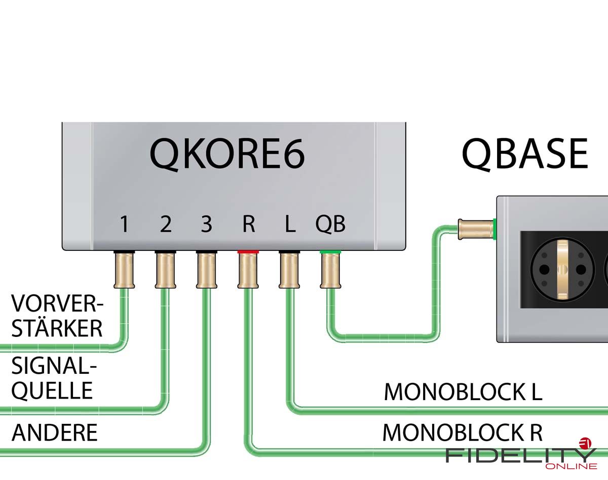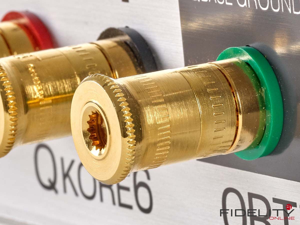 Angeschlossen wird der QKore – im Test war mit dem QKore6 die größte Variante mit fünf Geräteports von WBT – mittels beiliegender leuchtend grüner und ziemlich steifer QKore-Wire-Verbindungen, die es in verschiedenen Konfektionierungen gibt. Geräteseitig können das XLR- oder Cinchstecker sein oder auch einfach nur ein Kabelschuh, in den QKore geht es per Hohlbanana. Am Gerät hält idealiter ein nicht benutzter Aus- oder Eingang als Anschluss für die zusätzliche Erdung her.