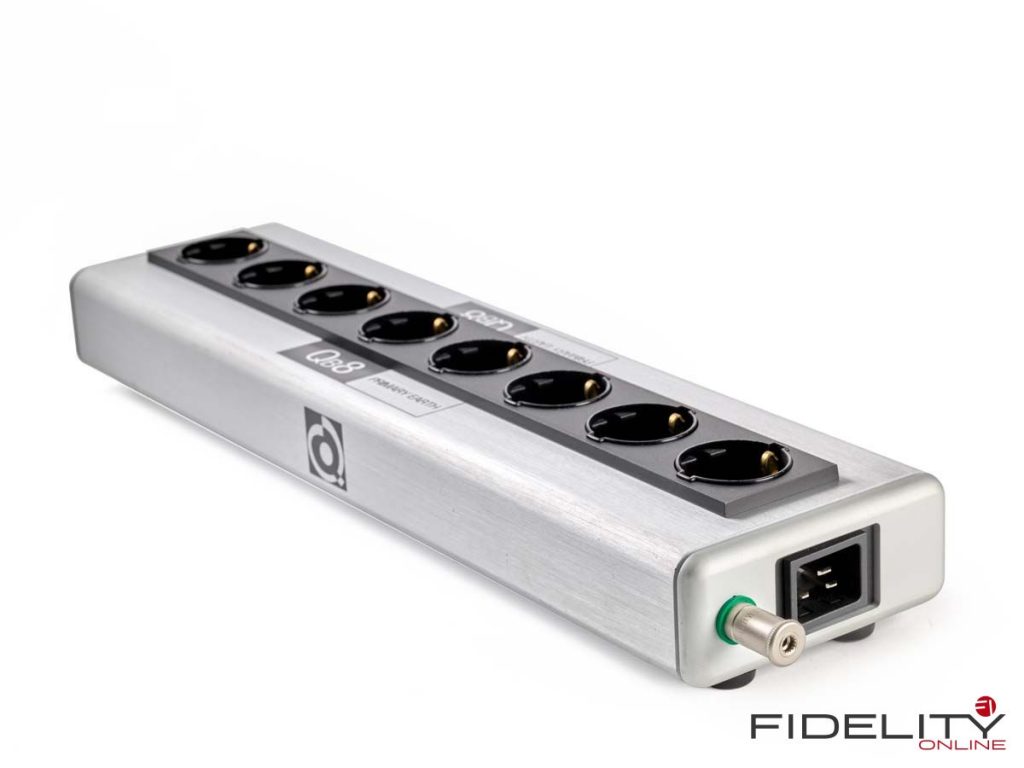 QRT besteht wie gesagt aus mehreren Komponenten. Herz des Systems ist eine exzellent verarbeitete Steckerleiste namens QBase, bei meinem Testmuster mit acht Steckplätzen, was auch umfangreichere Anlagenkonfigurationen abdecken sollte. Nach Rücksprache mit dem deutschen Vertrieb wurde an mich die 16-Ampere-Version ausgeliefert, erkennbar am IEC-Stecker mit liegenden „Messern“, der auch höhere Ströme, wie sie beispielsweise meine Mark-Levinson-Endstufe No. 27 zieht, klaglos bewältigt.