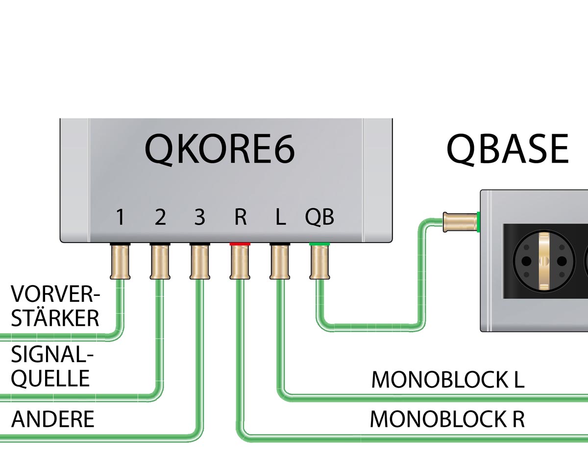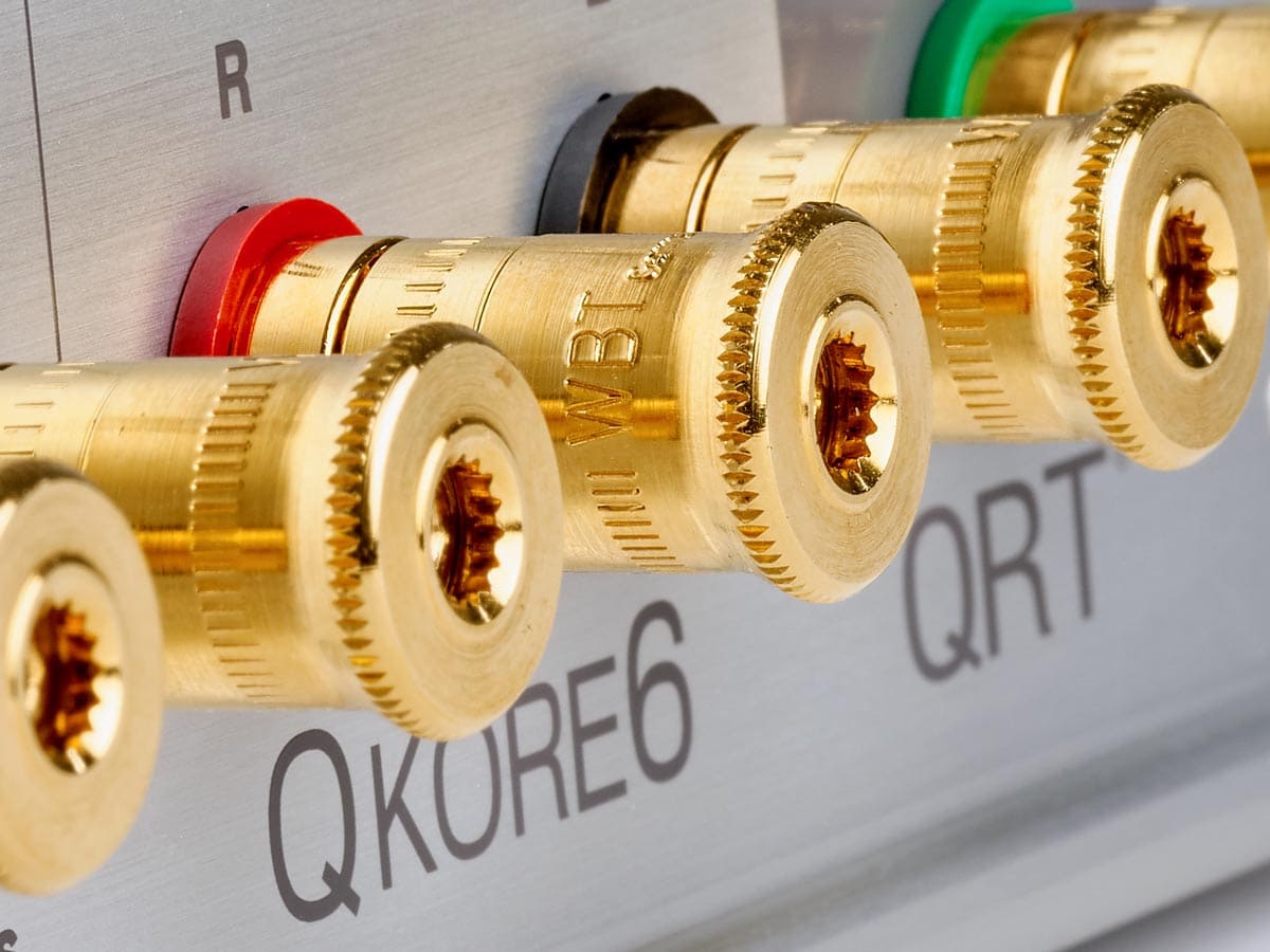 Die Anschlüsse am Masse-Sammelpunkt QKore sind mit hochwertigen Steckern ausgeführt und bieten zwei Spezialzugänge für stromhungrige Endverstärker.