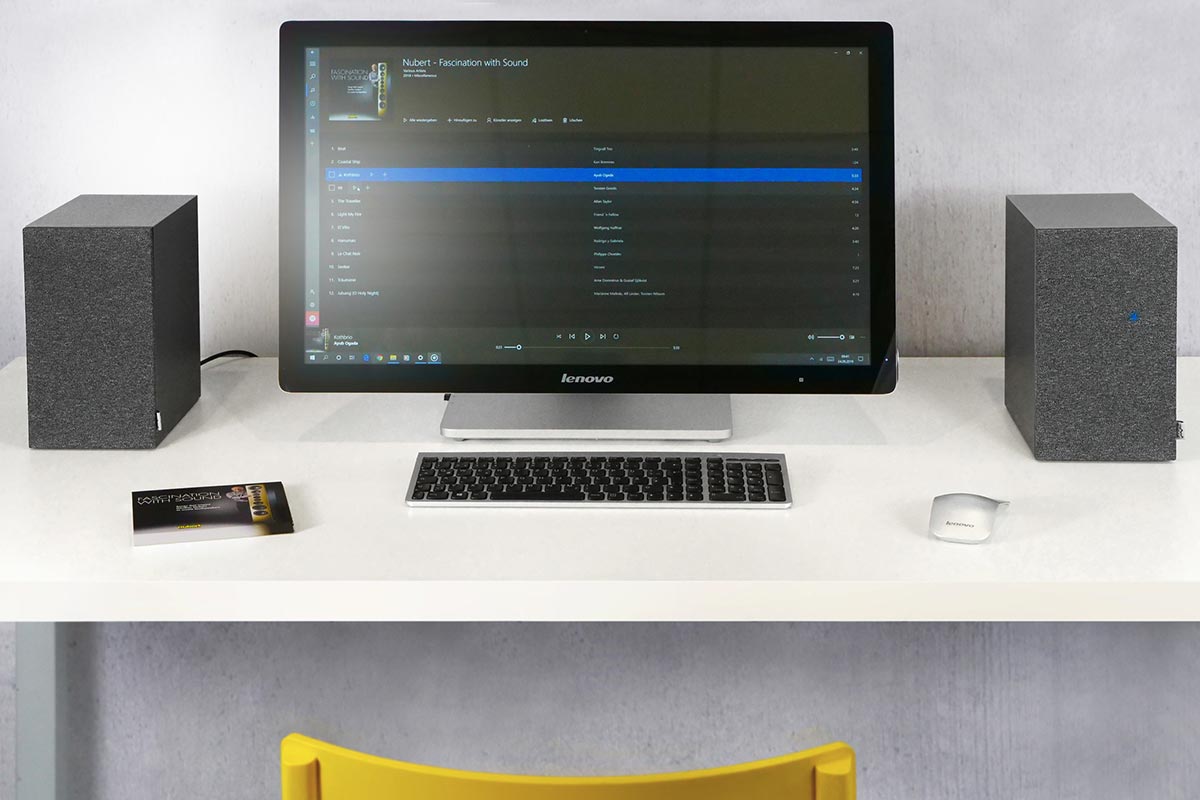 Schon im nächsten Augenblick ist das Laptop – ein Microsoft Surface – vernetzt und TIDAL strömt entspannte Frequenzen durchs Büro. Wobei … „entspannt“ ist relativ, denn es läuft Deichkinds Dinge. Der abgedrehte Titel entpuppt sich als genau die richtige Wahl: Die Nordlichter produzieren elektrische Klänge mit unverkennbarem HipHop-Einschlag und lieben tiefe Frequenzen fast genauso sehr wie ich. Ein tiefes „Booom“ wabert durch den Raum, während der Gesang plastisch und kristallklar zwischen den Boxen, knapp über dem Laptop-Monitor steht. Für so einen kleinen Monitor ist die Ausgangsleistung der Soundbar-Amps beachtlich: 40 Watt liefert die A-125 pro Kanal.