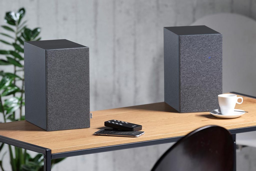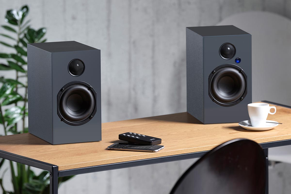 Wenige Tage nach meinem Besuch in Schwäbisch Gmünd erhalte ich einen Karton mit dem Test-Set. Ich packe das Paar sofort aus und platziere es auf meinem Schreibtisch. Kaum eine Armlänge von den Ohren entfernt. Das entpiddeln der Boxen dauert nicht mal fünf Minuten – und das auch nur, weil ich das Strom- und das Lautsprecherkabel von kleinen Drahtklemmen befreien muss. Nach dem Einschalten halte ich die Pairing-Taste auf der Fernbedienung gedrückt und tatsächlich beginnt der rechte Lautsprecher nach wenigen Momenten, blau zu blinken.