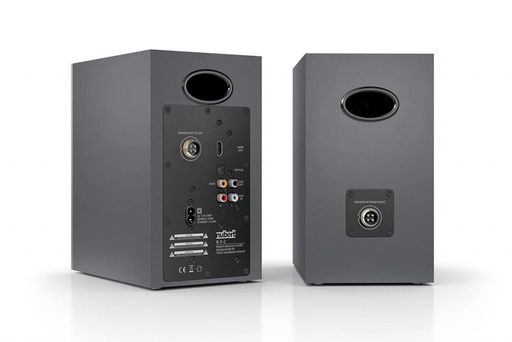 Das Produkt in unseren Händen ist ein kleiner Aktivmonitor. Ein Pärchen, um exakt zu sein. Und wenn wir es schon genau nehmen: Die Nubert nubox A-125 besteht aus einem aktivierten Böxchen, dass den Stereo-Verstärker sowie alle Anschlüsse enthält. Ein vierpoliges Kabel schlägt die Brücke zum zweiten Lautsprecher, der – sie ahnen es bereits – passiv aufgebaut ist. Die beigepackte Strippe misst drei Meter, fünf und sieben Meter können optional nachgeordert werden. Konzeptionell haben wir es mit einem Zweiweg-Monitoren zu tun, die Arbeitsteilung geschieht zwischen einem 12-Zentimeter Tief-/Mitteltöner und einer 25-Millimeter-Kalotte. Die Anschlussvielfalt ist überschaubar, aber mit Bedacht gewählt: AptX-Bluetooth, Toslink (optisch), S/PDIF (Cinch), ein Subwoofer-Out und HDMI samt ARC.