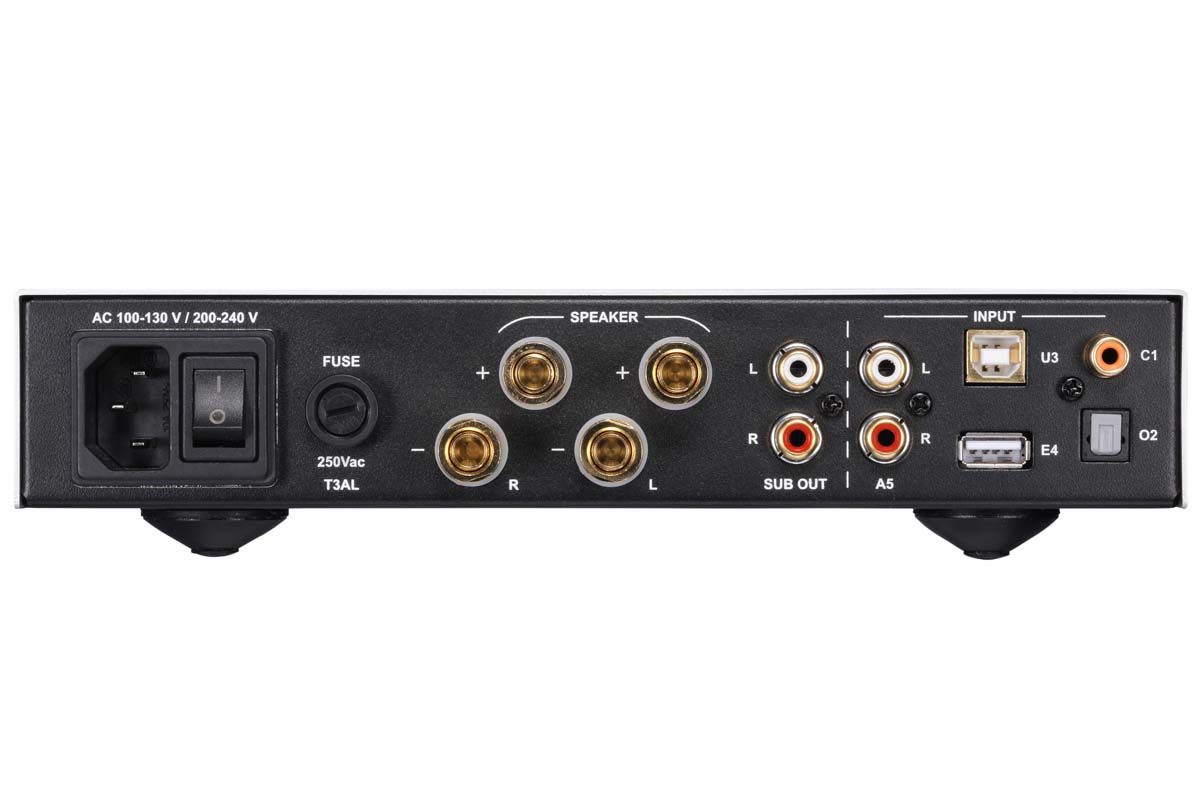 Im Inneren arbeitet ein AKM-D/A-Wandler, der PCM-Signale bis 32 Bit / 384 kHz sowie DSD256 verarbeiten kann. Die digitale Anschlussvielfalt umfasst einen optischen und einen koaxialen SPDIF-Eingang sowie einen USB-Port. Ergänzt wird die Ausstattung durch einen Line-Eingang, einen Line-Ausgang (z. B. für Subwoofer) und einen Erweiterungsport für Bluetooth- oder Streaming-Module.