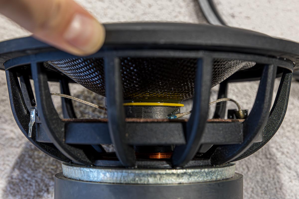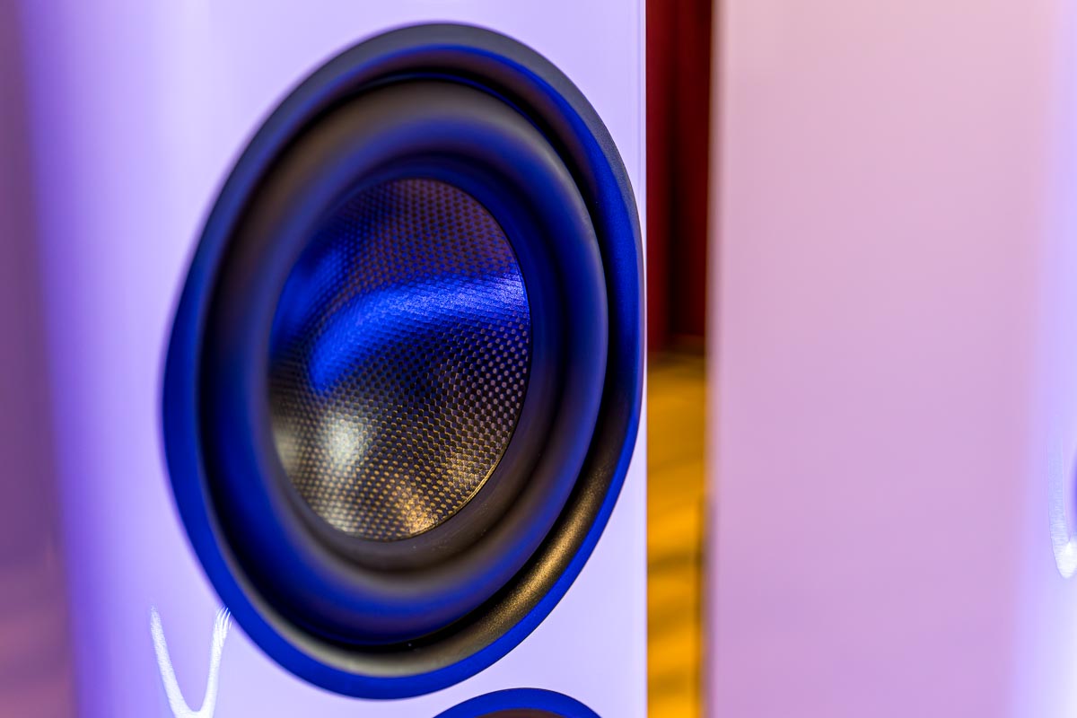 Den Anfang machen die Treiber: Statt der bewährten Nubert-Chassis ersannen die Tüftler vollständig neue Karbon-Membranen. Die liegen nicht nur bezüglich ihres superben Gewicht-zu-Steifheits-Verhältnisses auf einem neuen Niveau. Während der Abstimmung entdeckten die Entwickler, dass ein kleiner dämpfender Ring, der zwischen Membran und Antrieb eingeklebt wird, die Abstrahl- und Verzerrungseigenschaften der Membranen merklich optimiert. Er federt die Impulse des Antriebs minimal ab und lässt die Tief- und Mitteltöner sanfter (bzw. verzerrungsärmer) spielen.