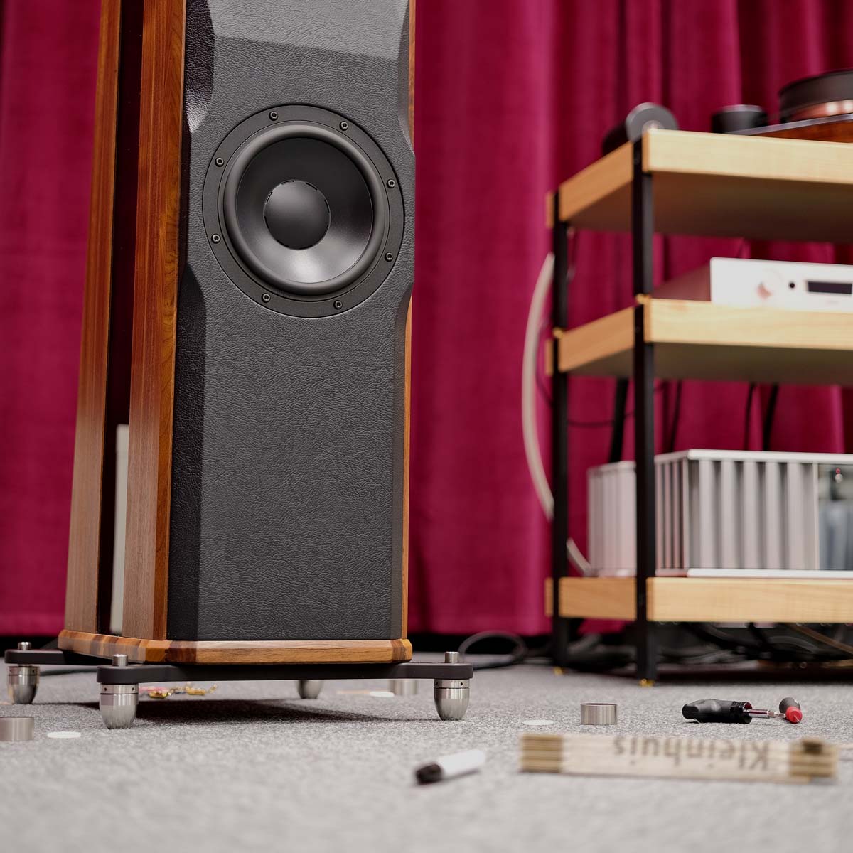 Routine tötet bekanntlich die Kunst. Ich erzähle Ihnen sicher nichts Neues, wenn ich schreibe, dass man durch zentimeterweises Rücken und gradweises Winkeln noch erstaunlich viel aus einem Lautsprecher rausholen kann – selbst wenn es eigentlich schon „sehr ordentlich“ klingt. Dass die Art der Ankopplung an den Boden einen deutlichen Unterschied machen kann, ist dem versierten Highender ebenfalls geläufig. Mit der Zeit lernt man auch, dass sich Kleinigkeiten, etwa die Art und Weise, wie man die Lautsprecherkabel am Bi-Wiring-Terminal verbandelt, klanglich bemerkbar machen können. Aber seien wir ehrlich: Bis das neue Schmuckstück ausgepackt und mit dem Komponentenfuhrpark verbunden ist, geht einige Zeit ins Land. Wenn nach ein, zwei initialen Fehltritten Bass und Bühne stimmen und die Stereomitte stabil ist, will man sich deshalb vielleicht erstmal mit Musik belohnen, ehe man die letzte – oder auch nur die vorletzte – Meile bei der Feineinrichtung geht. Wenn dann das Ergebnis auch schon ziemlich überzeugend ist, kann sich die Prozedur durchaus „bis auf Weiteres“ verschieben. Das gilt umso mehr, wenn man sich zwei 80-Kilo-Brocken ins Zimmer gestellt hat, bei denen jeder Zentimeter und jedes Grad Anpassung mit echter Arbeit verbunden sind.