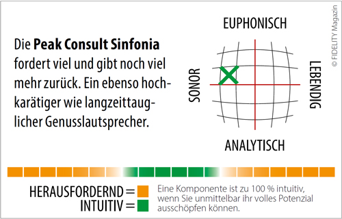 Die Peak Consult Sinfonia fordert viel und gibt noch viel mehr zurück. Ein ebenso hochkarätiger wie langzeittauglicher Genusslautsprecher.