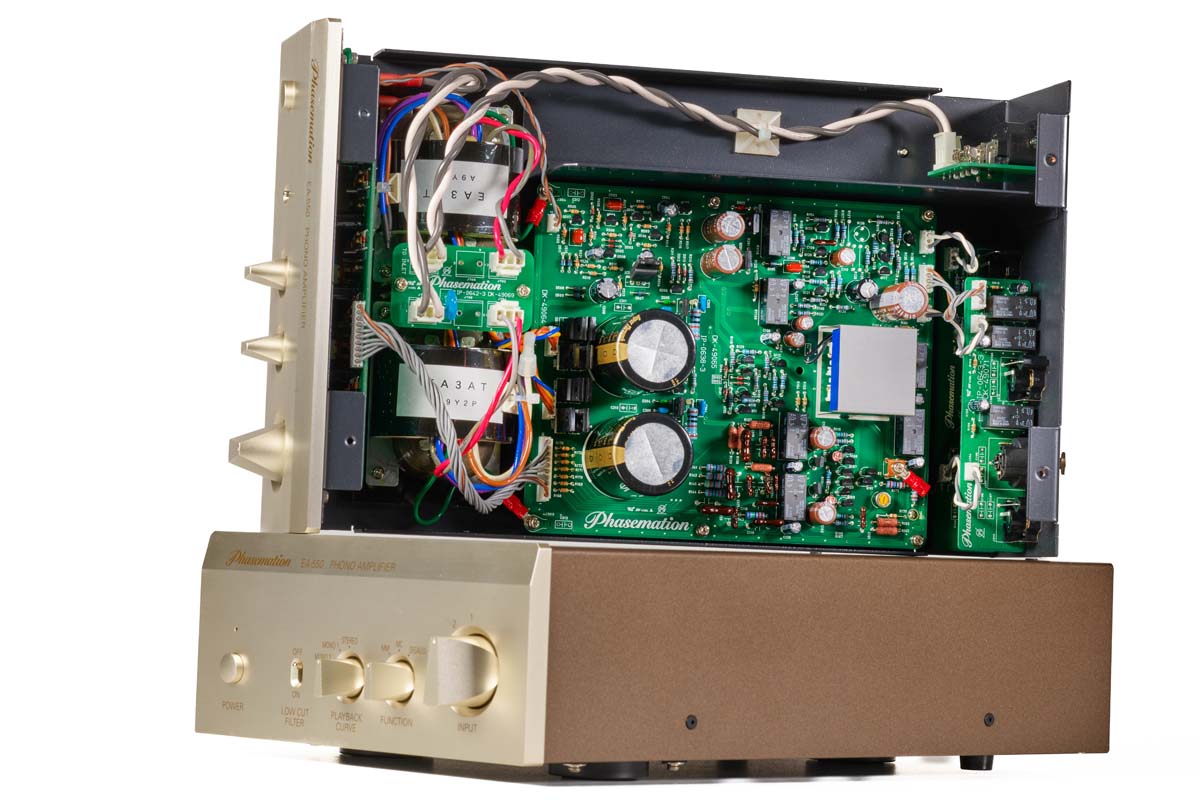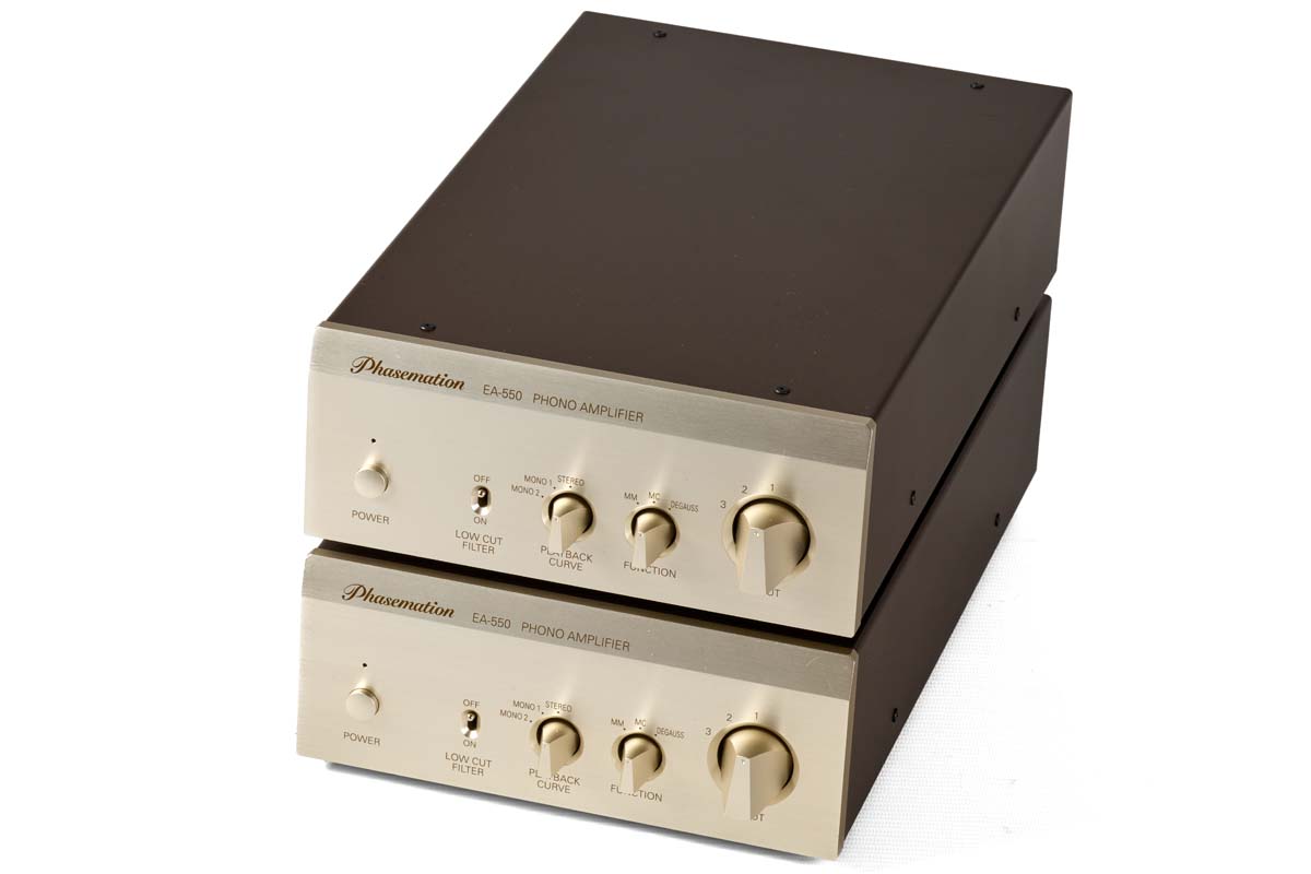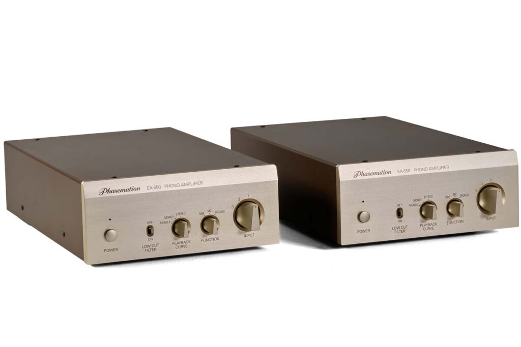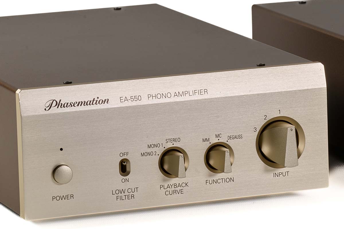 Phasemation bietet mit dem durchgängig diskret aufgebauten Doppelmono-Entzerrer EA-550 einen der hochwertigsten und vielseitigsten Transistor-Phonoverstärker überhaupt an.
