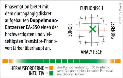 Fassen wir zusammen: Phasemation stellt mit dem EA-550 einen der hochwertigsten Transistor-Phonoverstärker überhaupt vor. Durchgängig diskret aufgebaut und ohne Rückkopplung – zweifelsfrei eine Phonostufe der Referenzklasse. Drei Eingänge bieten für den anspruchsvollen Phonophilen mit mehreren Laufwerken/Tonarmen die entsprechenden Anschlüsse. Zwei der drei Eingänge sind in XLR-Ausführung vorhanden; die kanalgetrennte Ausführung in spiegelsymmetrischen, separaten Gehäusen bezeugt den Anspruch an die Qualität. Klanglich werden intellektuelle wie emotionale Hörer gleichermaßen angesprochen. Kein Wunder, denn Phasemation gelingt es, analoge Ausnahme-Gerätschaften herzustellen, die in ihrer Klangästhetik einmalig sind