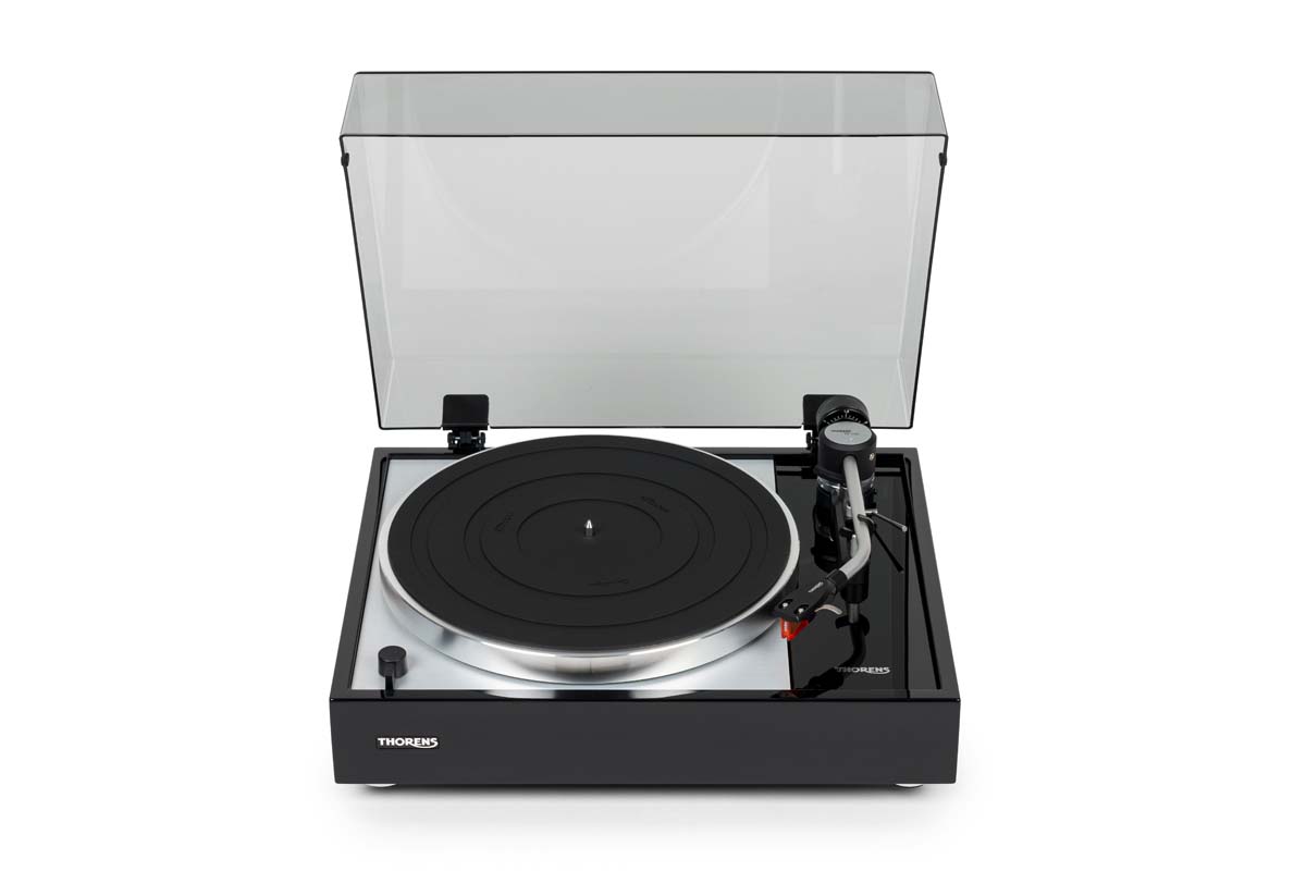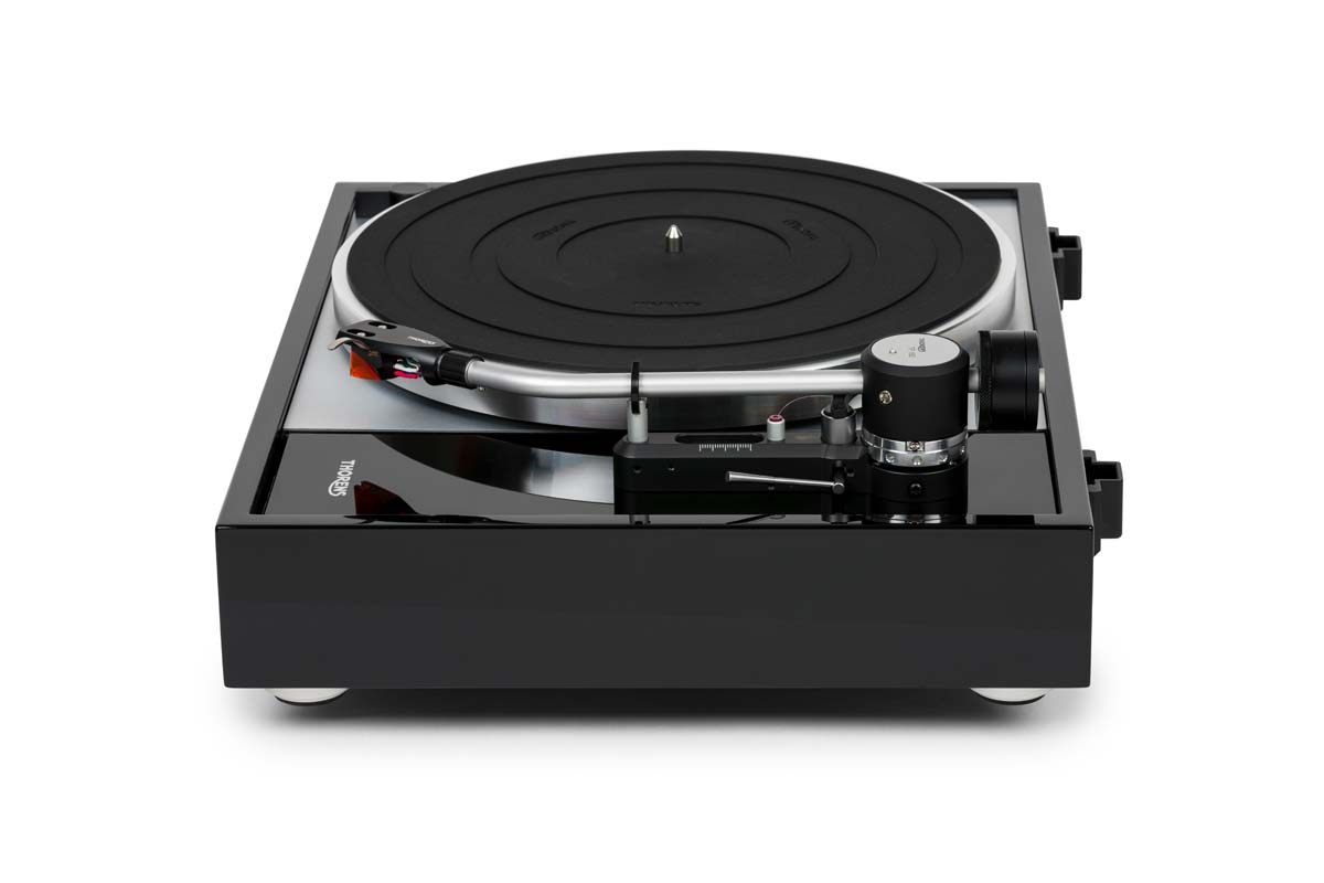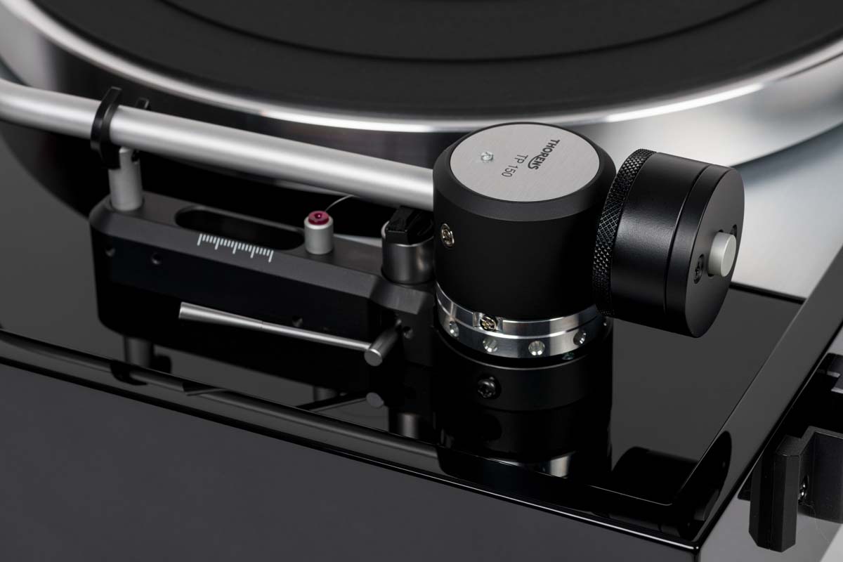 Schon damals war Thorens die erste Wahl für die gehobene Kundschaft, der Rest begnügte sich für den Anfang mit einem kleinen Dual und sparte fleißig für das Upgrade – auf einen TD 150 beispielsweise. Spätestens Anfang der siebziger Jahre wurden die markanten Zargen und J-förmigen Tonarme mit ihren charakteristischen kugelrunden Gewichten zur Justage der Auflagekraft zum optischen Synonym für eine gesamte Gerätegattung. Besonders die unter Liebhabern auch „Schwabbler“ genannten Subchassis-Laufwerke haben noch heute ihre eingefleischte Fangemeinde. Auch wenn der TD 1500 erst vor einem knappen halben Jahr präsentiert wurde, wirkt er auf den ersten Blick vertraut wie ein alter Klassenkamerad. Wobei ich mir nicht sicher bin, ob die Qualität des schwarzen Hochglanzlacks schon Anfang der Siebziger so vollendet war. Der Teller wird heute als Ganzes aus Aluminiumdruckguss gefertigt, was dem Kunden das Gefummel mit Subteller und Riemen sowie Thorens unnötig hohe Herstellungskosten erspart.