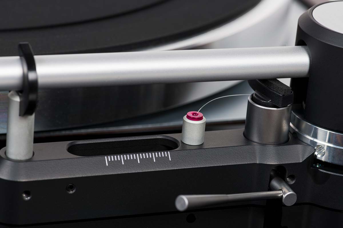 Am rückseitigen Anschlussfeld lassen sich nicht allein gewöhnliche Cinchstrippen andocken, für MC-Systeme stehen zusätzlich symmetrische Ausgänge in XLR-Ausführung zur Verfügung. Auch das Netzteil findet hier Anschluss, doch aufgrund seiner Gewöhnlichkeit keine nähere Erwähnung. Der Teller dreht sich, also wird es wohl seinen Zweck erfüllen. Näher sollte man sich mit dem von Grund auf neu entwickelten Tonarm beschäftigen. Auf den zweiten Blick erkennt man die Schrauben zur Verstellung der Armhöhe, sollte ein Wechsel des Tonabnehmers eine Korrektur des VTA erfordern. Die zu lösenden Schrauben sind gut zugänglich, die Einstellung gelingt auch hier dank weich laufender Gewinde fein und präzise, ohne dass der Arm plötzlich nach unten wegrutschen kann. Die Einstellung des Azimuts ließe sich, falls nötig, durch Lösen und Verdrehen der Headshell oder Verdrehen des Armrohrs korrigieren.
