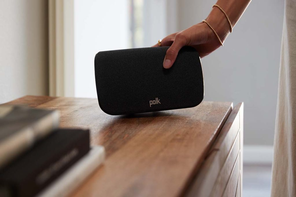Die im Lieferumfang der MagniFi Max AX SR enthaltenen Polk SR2 Wireless Surround-Lautsprecher erweitern das Klangerlebnis mit echten Surround-Effekten.