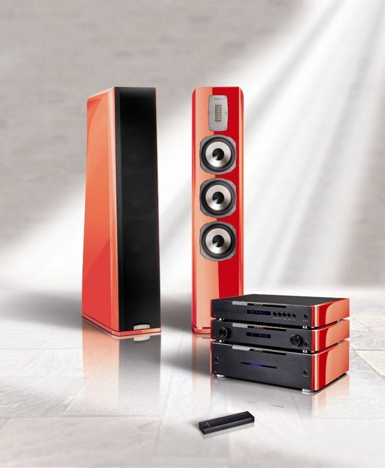 Mehrere Hundert Teilnehmer haben in den vergangenen Wochen bei einer Online-Umfrage aus zehn Farbvorschlägen gewählt. Die Entscheidung für Blutorange fiel mit einem Viertel der Stimmen. Auf der HIGH END wird die erste Komplettanlage der Jahres-Edition – bestehend aus Aurum Wotan, P8, M8 und Aurum C5 DA – im neuen Farbton zu sehen sein.