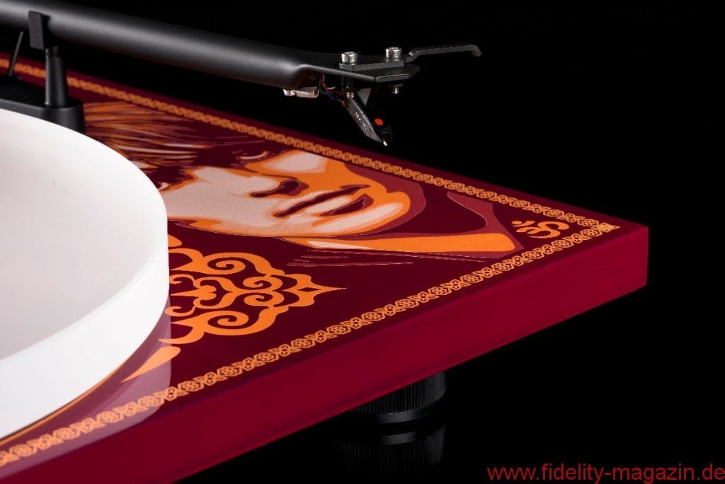 The artwork on the turntable was created by Studio Number One. The original artwork was designed by Shepard Fairey, one of the best known street artists around, for the Harrison family. It features a distinctive portrait of George Harrison and forms together with the indian patterns and the analogue mastering machine (below the acrylic platter) a very unique look.