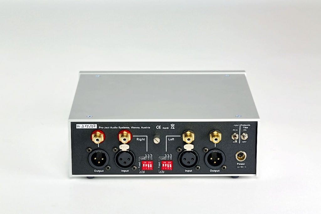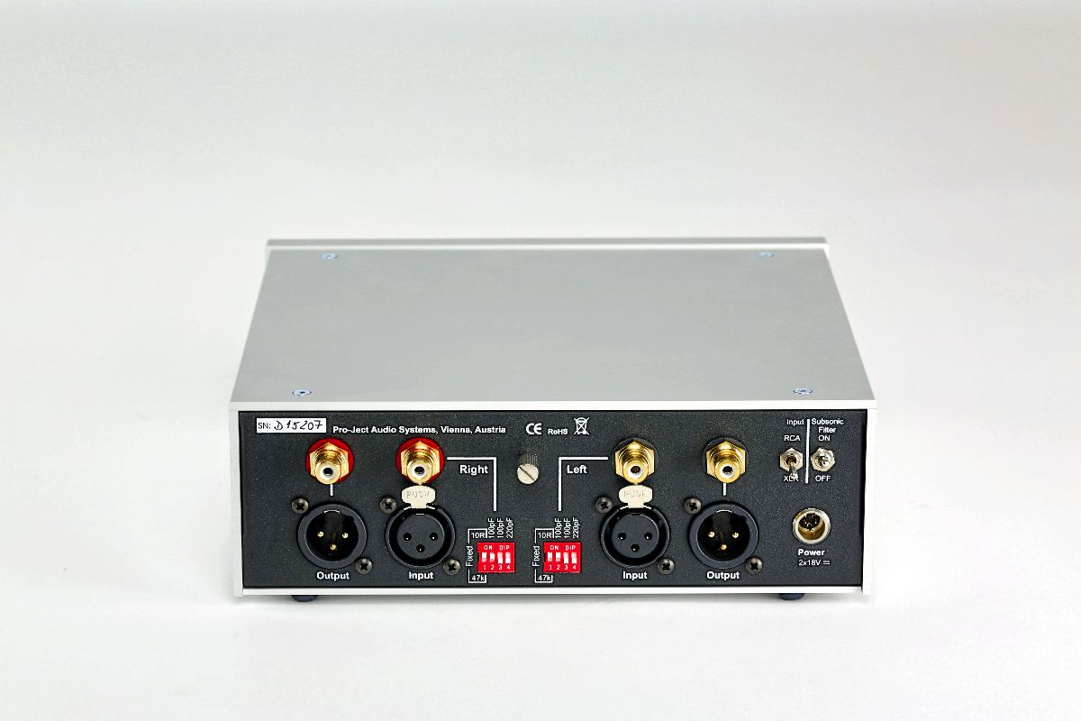 Bevor es überhaupt losgeht mit dem Plattenhören, verblüfft die Kleine mit symmetrischen Anschlüssen. Und zwar nicht nur als störungsarme Verbindungsvariante zum nachfolgenden (Vor- oder Voll-)Verstärker, sondern eben auch für den Eingang, also die Verbindung vom Plattenspieler respektive Tonabnehmersystem. Praktischerweise bietet Pro-Ject passende, preisgünstige Phonokabel mit XLR-Steckern an, die ich ausführlich mit besagtem SuperPack-Spieler ausprobieren konnte – sehr empfehlenswert. Sobald die grundsätzliche Anschlussfrage geklärt ist, kümmert sich die Phono Box RS bereitwillig um alle Wünsche von Tonabnehmer und Schallplatte. Neben üblichen Prepre-Standards wie einstellbarem Verstärkungsfaktor (über kleine Kippschalter auf der Front) und zuschaltbarer Kapazität (via Mäuseklavier auf der Rückseite) kann man als MC-Betreiber bei der Österreicherin auch mal so richtig schön am Rad drehen. Der griffige, satt und „teuer“ laufende Drehregler auf der Front bietet – wenn der dazugehörige Kipp-schalter von F („fix“) auf V („variable“) umgeschaltet wurde – eine stufenlose Anpassung des (MC-)Abschlusswiderstands zwischen 10 und 1200 Ohm.