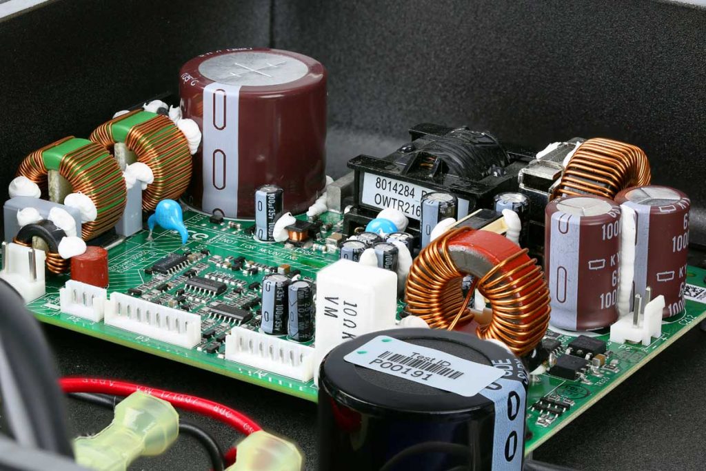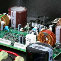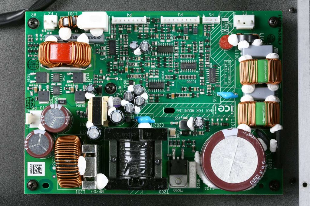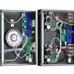 Öffnet man den Deckel der Endstufe S300, fallen gute Bekannte ins Auge: zwei Endstufen-Module aus der ICE-Power-Reihe. Diese kombiniert Paul McGowan allerdings mit einer eigenen Class-A-Eingangsstufe, die mit den typischen vergossenen „Gain Cell“-Modulen von PS Audio bestückt sind. Die komplette Stromversorgung läuft über die Schaltnetzteile der Endstufen, folglich sucht man vergeblich irgendwelches Schwermetall. Ein Fliegengewicht also – aber eines, das es durchaus in sich hat, wie wir noch merken werden …