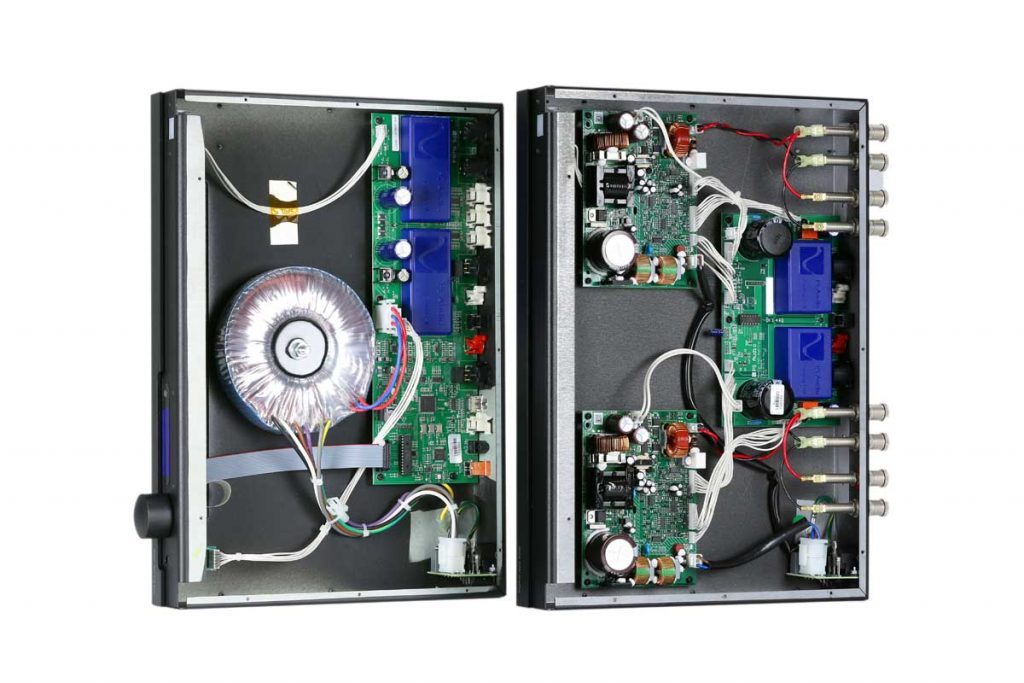 Besonderheiten: vollsymmetrische, bis 2 Ω stabile Schaltung, Dual Mono mit jeweils eigener Stromversorgung, Ausgangsklemmen aus massivem vergoldetem Kupfer