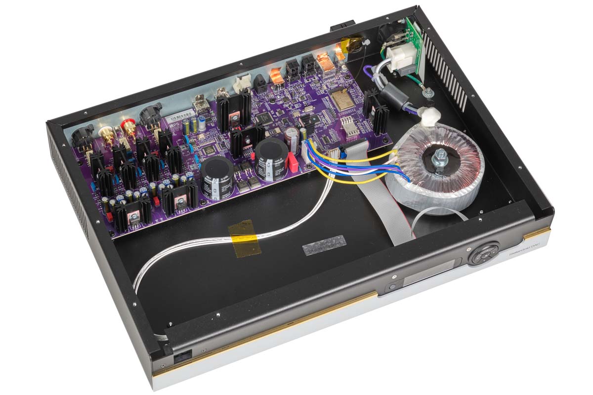 Den Großteil der Schaltung macht die Stromversorgung aus. Die vom Ringkerntrafo hinter der Gerätefront zugeführte Spannung wird separat für die einzelnen Audioschaltkreise aufbereitet. Dass PS Audio sich in Sachen Stromversorgung einen Namen gemacht hat, ist kein Geheimnis. Auf der Platine direkt an den Ein- und Ausgängen an der Rückseite der stabilen Behausung findet ein achtkanaliger DAC-Chip (2 x 4 Wandler-Pfade) aus dem Hause ESS Platz. Direkt daneben befindet sich die noch von Darren Myers entwickelte Class-A-Ausgangsstufe (Myers ist seit Mitte 2023 bei Parasound). Und Myers ist nicht nur Entwickler, sondern auch leidenschaftlicher Musikhörer, ein Audiophiler im besten Sinne.