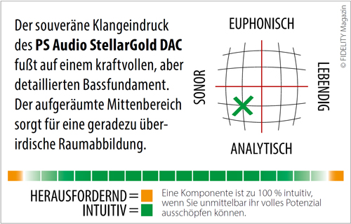 Der souveräne Klangeindruck des PS Audio StellarGold DAC fußt auf einem kraftvollen, aber detaillierten Bassfundament. Der aufgeräumte Mittenbereich sorgt für eine geradezu überirdische Raumabbildung.