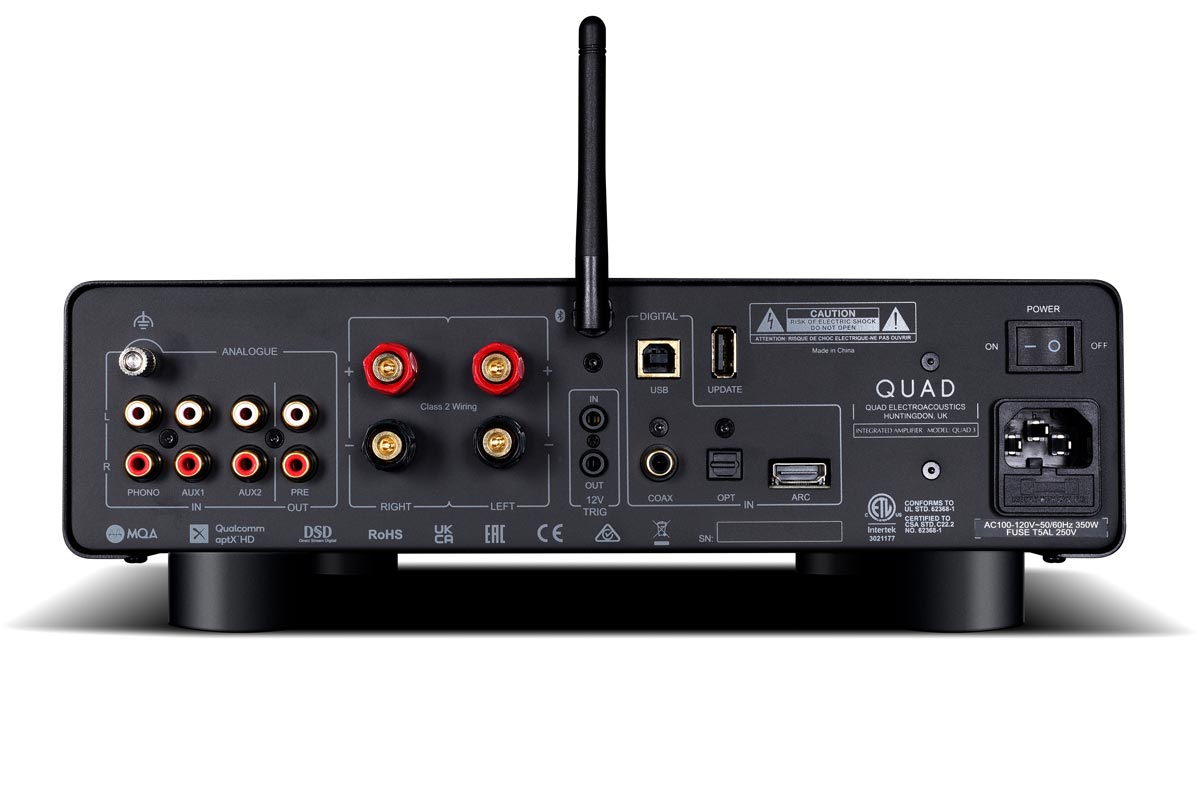 Mit einer Breite von 30 cm und einem Gewicht von 5,3 kg eignet sich der Quad 3 sowohl für klassische HiFi-Racks als auch für den Einsatz im Wohnraum unter dem Fernseher. Herzstück ist eine diskret aufgebaute Class-AB-Endstufe mit 2 × 65 W Leistung an 8 Ohm. Drei Line-Eingänge, ein MM-Phono-Pre sowie digitale Anschlüsse (Koax, Toslink, USB-B) und Bluetooth aptX HD sorgen für hohe Anschlussvielfalt. Ein Pre-Out ermöglicht zudem die Einbindung externer Endstufen oder aktiver Subwoofer.