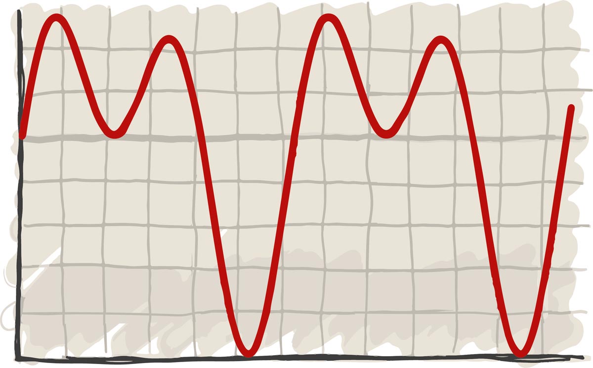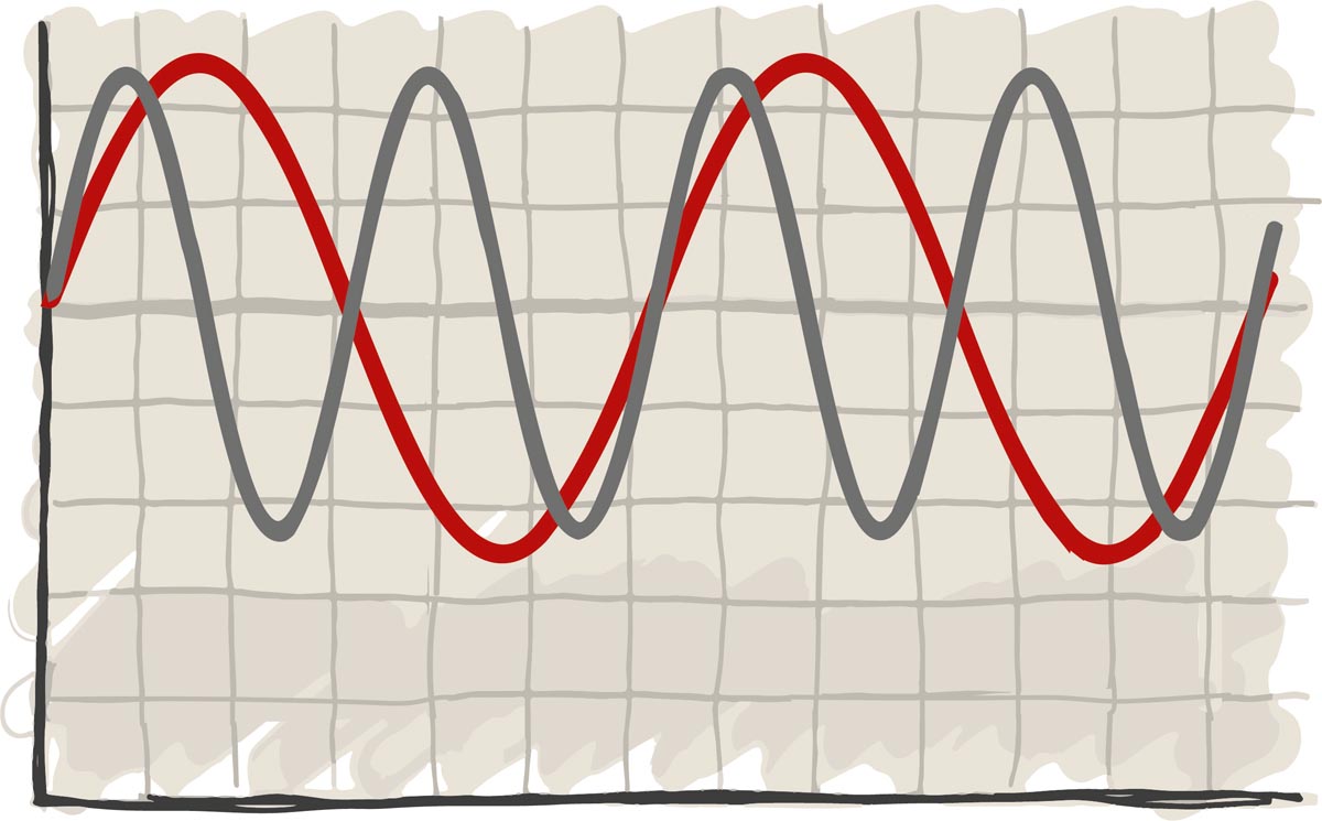 Die Grundschwingung ist freilich nur ein Teilaspekt des Phänomens. Auch die „Harmonischen“ – Frequenzen, die geradzahlig auf der Basisschwingung aufbauen – werden zwischen den Wänden gefangen. Bei 100 Hz sind das 200 Hz, 400 Hz, 800 Hz und so weiter … die Oktaven, wie ein Musiker sagen würde. Und genau hier nähern wir uns auch einer Erklärung des beschriebenen Geistereffekts: Schon wenn sich nur zwei Harmonische überlagern, entsteht eine tückische Interaktion. Ihre positiven und negativen Auslenkungen stehen durch die Beziehung zur Raumdimensionen statisch im Zimmer. Ihre Amplituden addieren oder subtrahieren sich. Grundfrequenz und Harmonische werden dabei drastisch verstärkt und als Resonanzen wahrnehmbar. Zudem entsteht aus den reinen Sinustönen eine völlig neue, komplexere Wellenform (siehe Illustration), die so nicht im Ausgangsmaterial vorhanden war. Eine Form der Verzerrung, wie wir bereits hier gelernt haben.