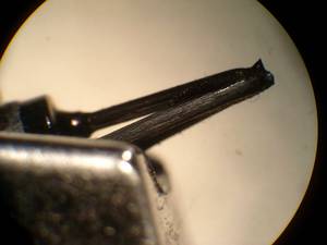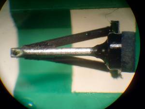 Es liegt nahe, zumindest fur die ersten Experimente auf ein preiswertes System zuruckzugreifen. Jo Soppa entschied sich fur das Audio Technica AT-95E, ein auserordentlich beliebtes und weit verbreitetes Moving- Magnet-System, das derzeit fur etwa 35 Euro zu haben ist. Ab Werk besitzt es einen geraden Nadeltrager aus Aluminium und einen gefassten, elliptischen Diamanten. Entfernt man den Nadeleinschub, sieht man auch die beiden zylindrischen Magnete, die im rechten Winkel zueinander schrag nach oben weisen, wo sie im eingesetzten Zustand in eine Armatur aus Spulen eintauchen. Offensichtlich lasst dieser Aufbau noch genugend Raum fur die von Jo Soppa eingesetzten zusatzlichen Verstrebungen. Zwei langere schwarze Stabchen (vermutlich aus einem Carbonmaterial) verbinden dabei die Spitze des Aluminiumnadeltragers mit den oberen Kanten der Magnete. Ein weiterer, deutlich kurzerer Stab verbindet noch die beiden Magnete untereinander, sodass sie zusammen mit dem originalen Nadeltrager ein Tetraeder (quasi eine „Pyramide“ mit dreieckiger Grundflache) bilden. Diese Art der Aufhangung nennt deren Schopfer „Raumnadel“ (engl.: „room cantilever“; Abk.: RC). Die Verstrebungen werden offenbar mit einem schwarzen Kleber befestigt, Spuren davon finden sich allerdings auch auf dem Dampfungsgummi und sogar am Diamanten selbst. Mit noch groserem Arbeitsaufwand ist die ebenfalls erhaltliche Holzversion gefertigt. Der ursprungliche Tonabnehmer wird von seinem Kunststoffgehause befreit und in einen passend gefrasten Holzkorper eingesetzt. Der giftgrune Nadeleinschub wird bis auf ein Minimum reduziert und wiederum mit dem schwarzen Kleber am Korper befestigt. Damit ist ein schneller Nadelaustausch, wie bei der Basisversion, nicht mehr moglich. Allerdings ist der Nadeltrager jetzt auch „bombensicher“ am Gehause befestigt und das sogenannte „Time Smearing“ – Beeintrachtigungen des Abtastsvorgangs durch minimales Verrutschen des Nadeleinschubs – wird wirkungsvoll verhindert.