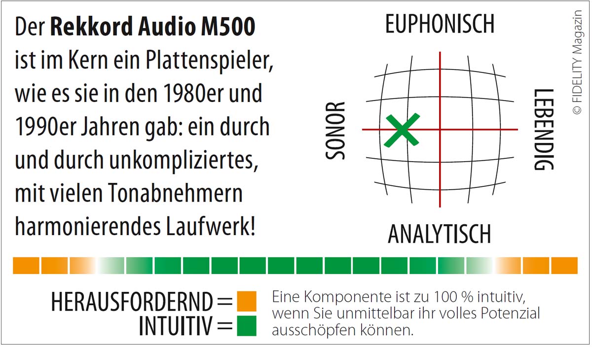 Der Rekkord M500 ist gleichwohl alles andere als ein „Me-too-Produkt aus der Lifestyle-Ecke. Zur Einordnung seiner Qualitäten hat Jürgen Reichmann gleich zwei M500 in die FIDELITY-Redaktion geschickt. Einer in der vorjustierten Grundkonfiguration, wie er aus der Manufaktur in St. Georgen kommt: Hier prangt ein Ortofon-Tonabnehmer, der 2M Blue Moving Magnet, in der Headshell – ordentliches MM-Equipment für High-End-Einsteiger ohne den Anspruch, auch noch die letzten Einzelheiten aus der Plattenrille zu kitzeln. Dafür erfreulich homogen, klangfarbenstark und auf den Punkt spielend wie ein guter Ensemblemusiker. Damit ist der M500 ein unkomplizierter Spielpartner für die Stunden, die dem entspannten Hören entspannter Musik gehören.