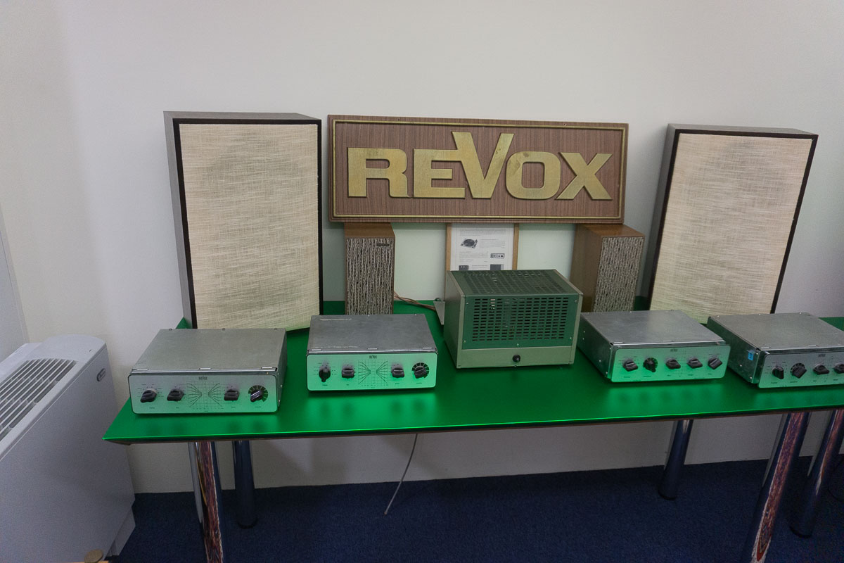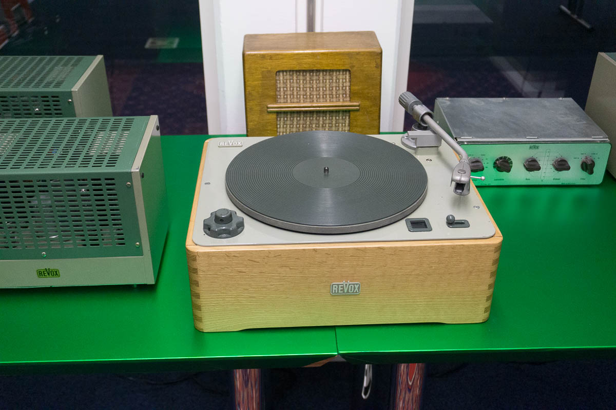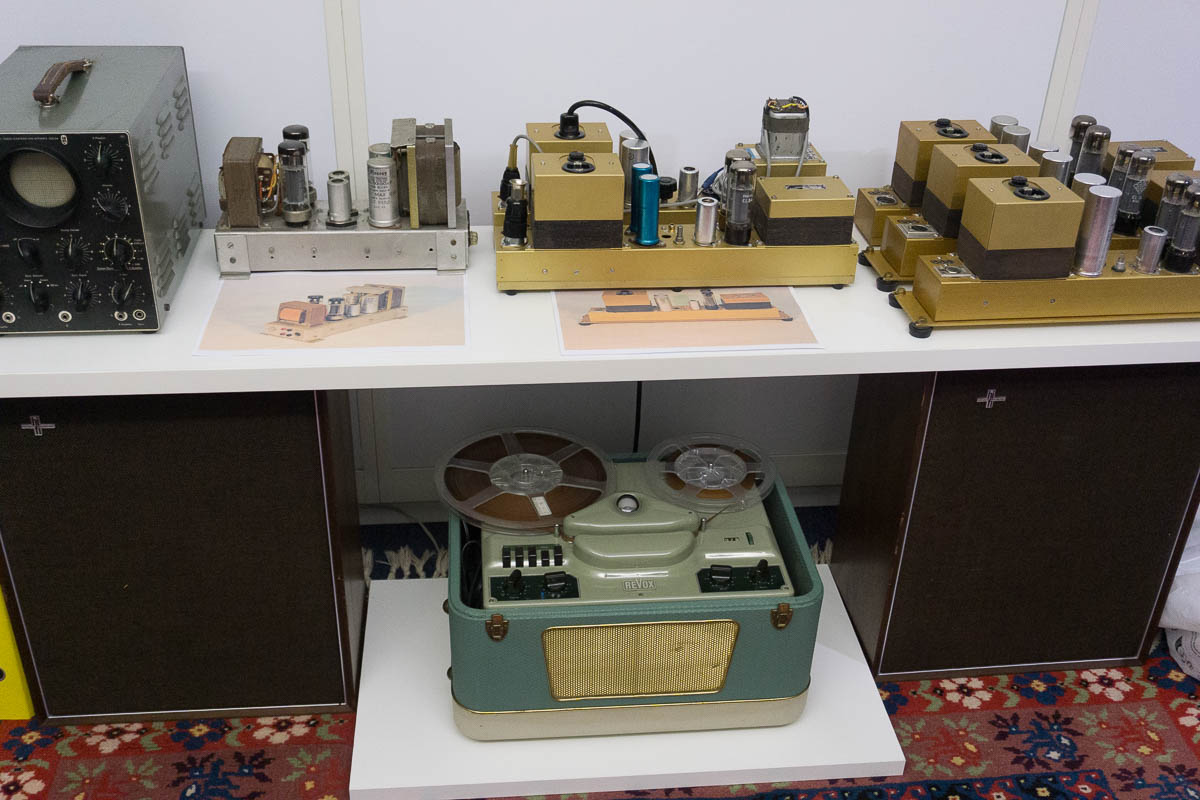 Nach der kurzweiligen Einführung ging es hinein in das eigentliche Herzstück des Hauses: Die Ausstellung ist weitestgehend chronologisch aufgebaut, beginnt im Jahr 1931 und erstreckt sich über rund 600 Quadratmeter. Gezeigt werden auch Exponate, die merklich über die eigentliche Revox-Geschichte hinausreichen. Radiogeräte etwa, die Revox-Gründer Willi Studer während seiner Anstellung bei Otto Roth in Herzogenbuchsee und später bei der Bansi-Ammann AG entwickelte. Auch die seltenen und aufwendig gebauten TELL-Radios aus seiner ersten Firma, der Helvetia-Radioapparate-Fabrik, sind vollständig erhalten und funktionsfähig ausgestellt.
