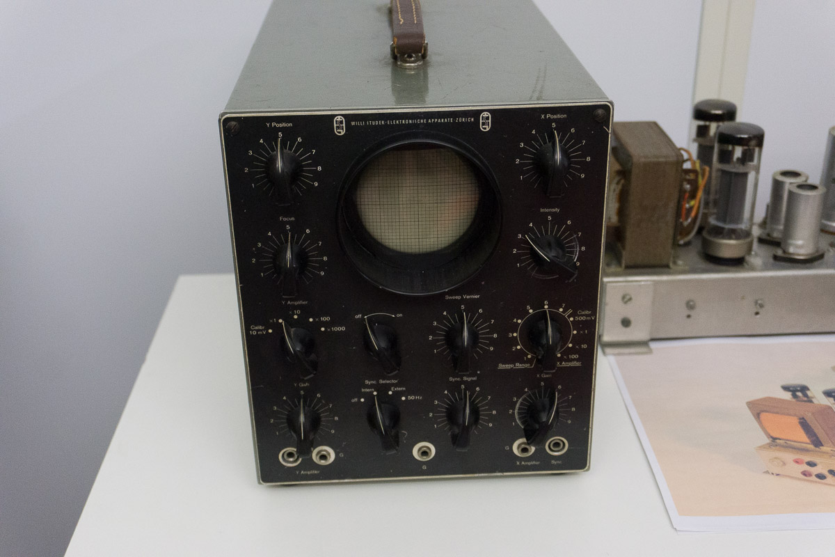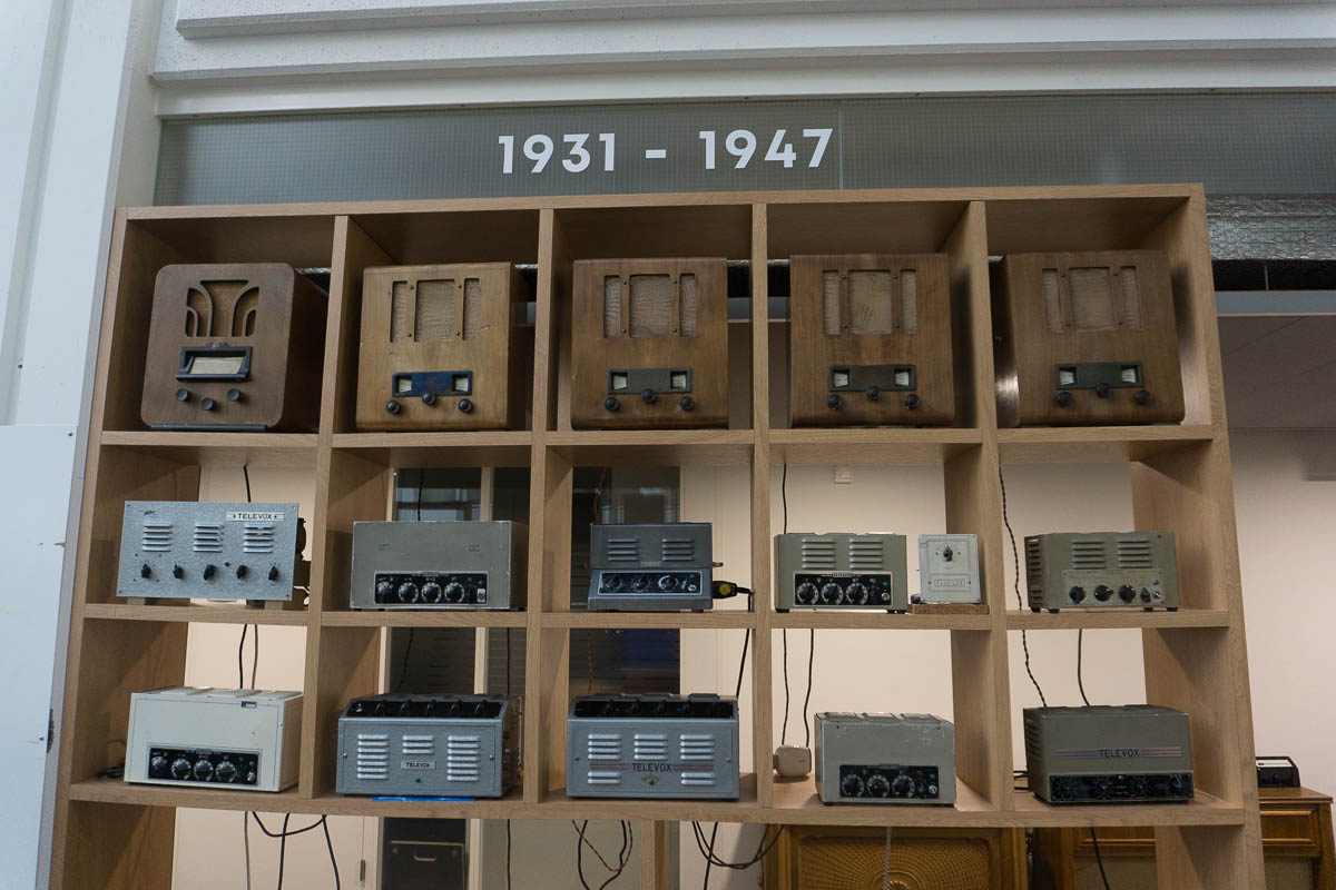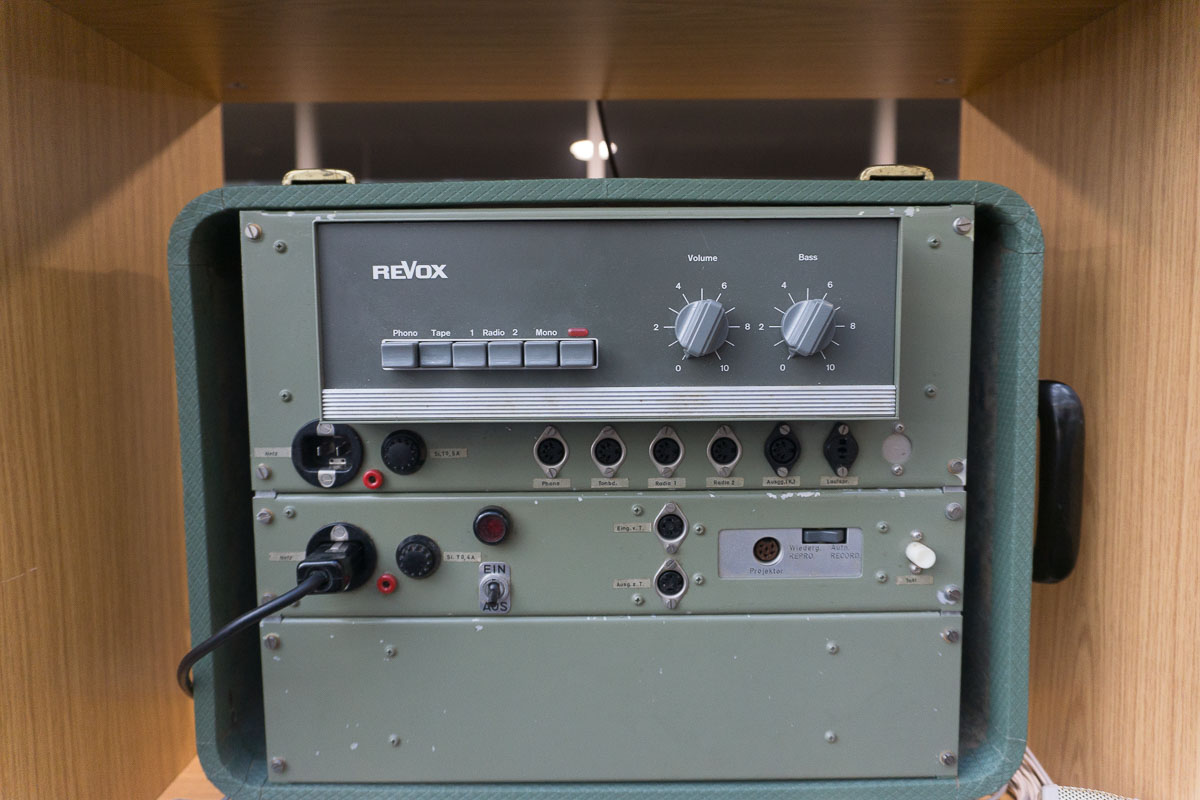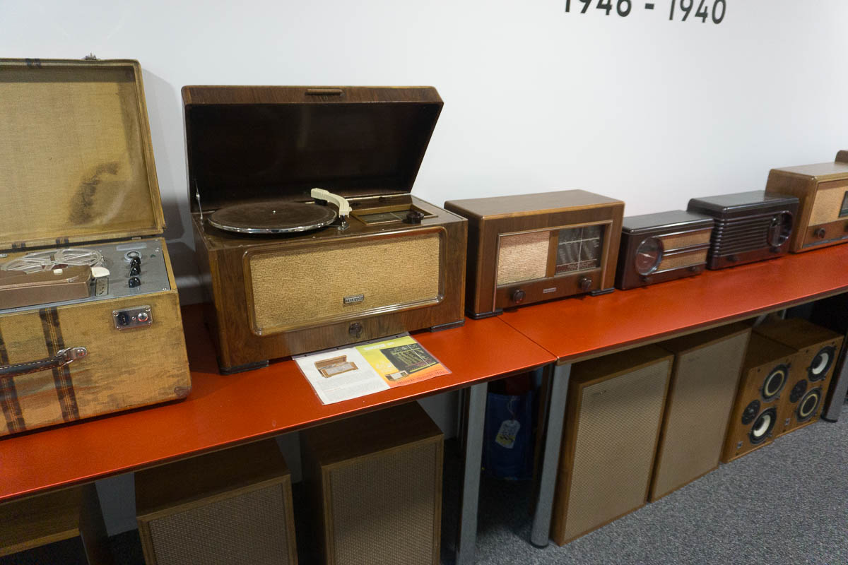 Nach der kurzweiligen Einführung ging es hinein in das eigentliche Herzstück des Hauses: Die Ausstellung ist weitestgehend chronologisch aufgebaut, beginnt im Jahr 1931 und erstreckt sich über rund 600 Quadratmeter. Gezeigt werden auch Exponate, die merklich über die eigentliche Revox-Geschichte hinausreichen. Radiogeräte etwa, die Revox-Gründer Willi Studer während seiner Anstellung bei Otto Roth in Herzogenbuchsee und später bei der Bansi-Ammann AG entwickelte. Auch die seltenen und aufwendig gebauten TELL-Radios aus seiner ersten Firma, der Helvetia-Radioapparate-Fabrik, sind vollständig erhalten und funktionsfähig ausgestellt.