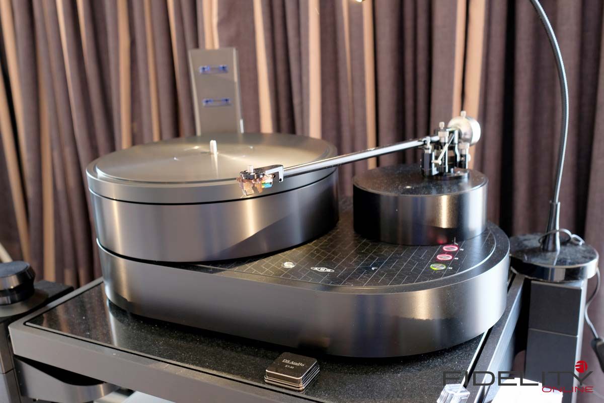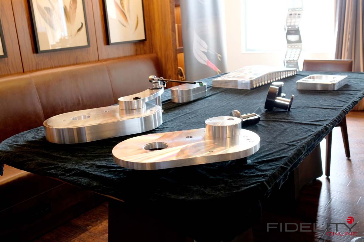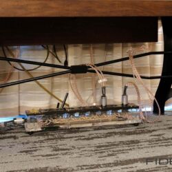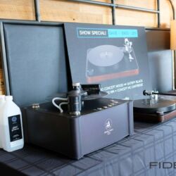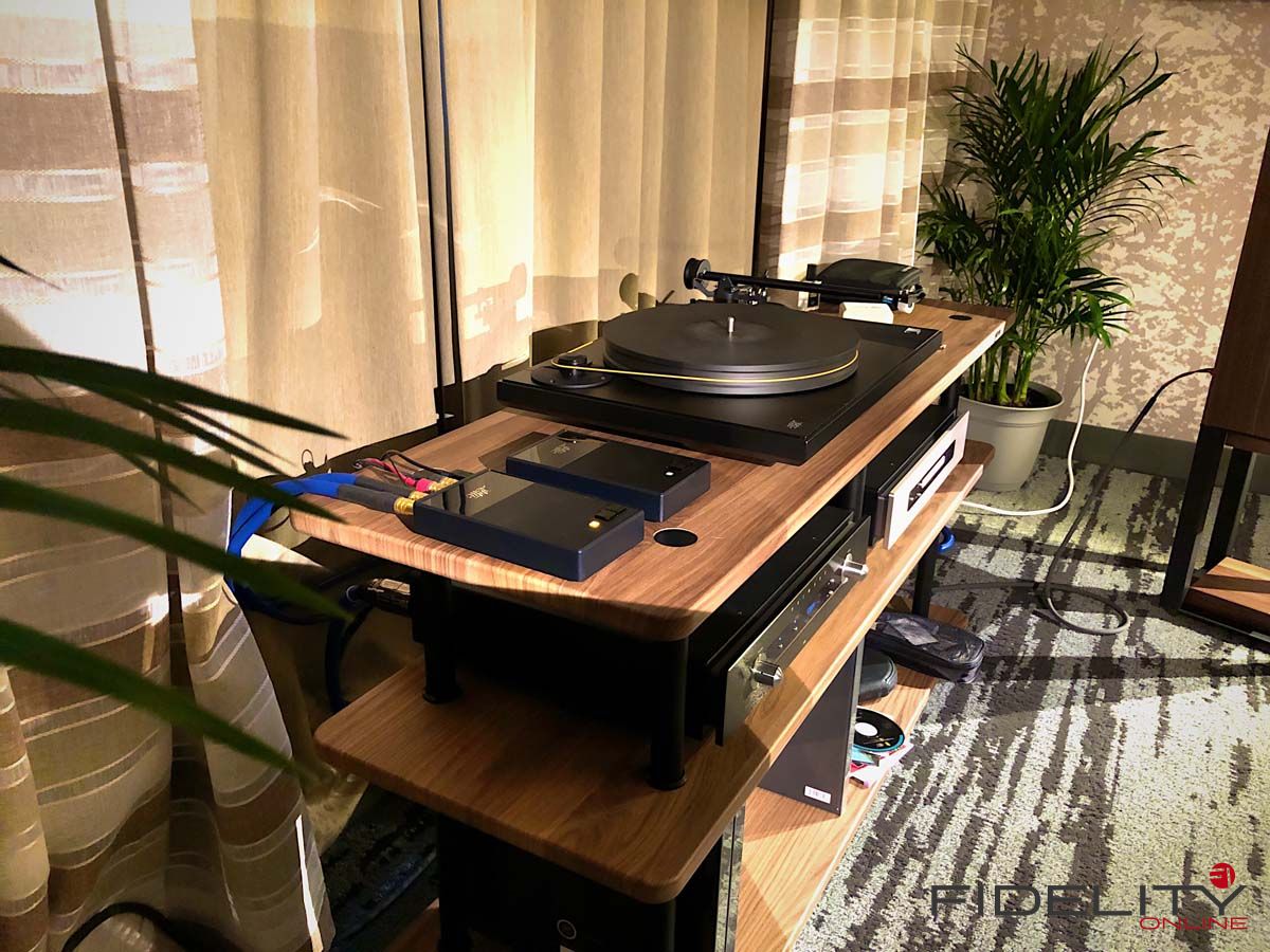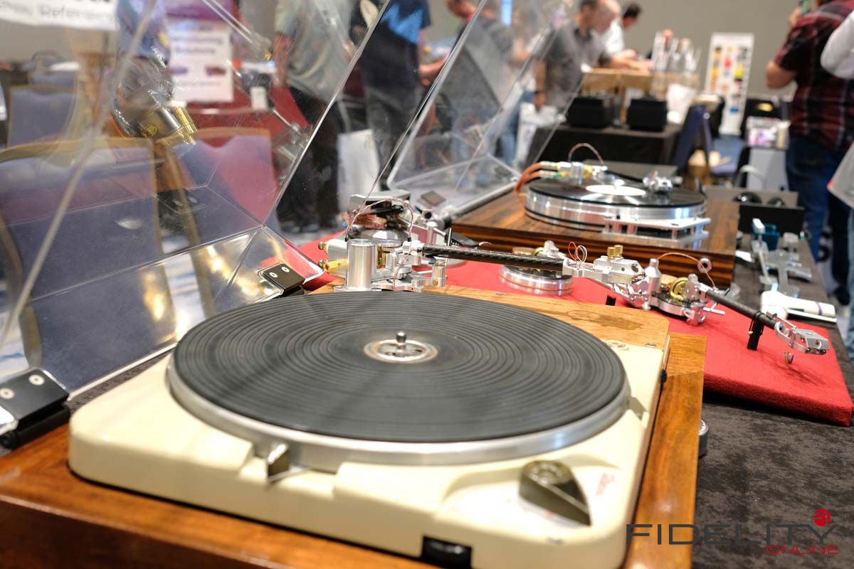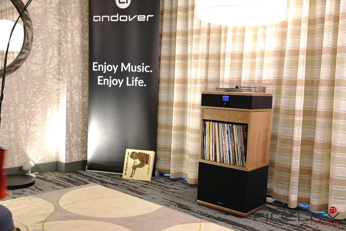 Das ungewöhnlichste Setup, weil eigentlich gar kein Setup, gab es bei Andover Audio zu sehen. Draußen, vor deren Zimmer auf dem Flur ein richtig fetter Sound, ging man rein war nichts zu sehen, außer einem Plattenspieler auf einer Art Rack, sonst nichts. Die Lösung: Das Rack war der eigentliche Lautsprecher. Oben ein Rundum-Array und unten ein Subwoofer. Ob es eine gute Idee ist einen Plattenspieler auf einen Lautsprecher zu stellen bleibt dahingestellt. Funktioniert hat es aber tatsächlich großartig. Der Raum glich einer akustischen Täuschung.
