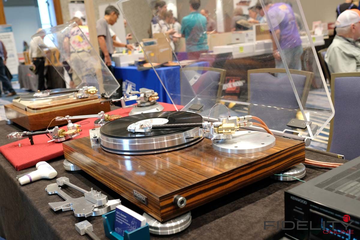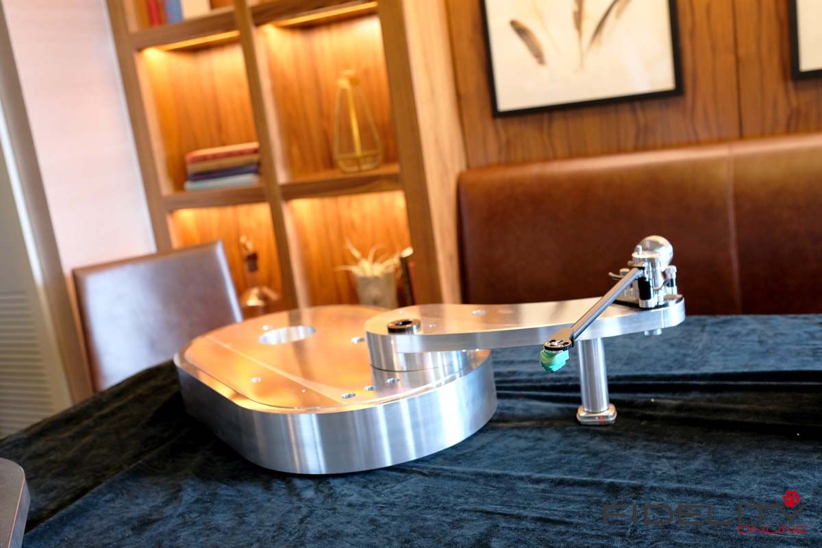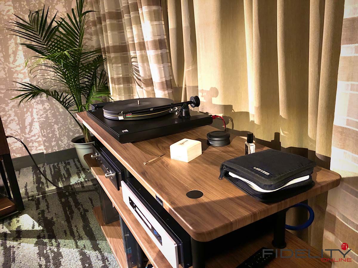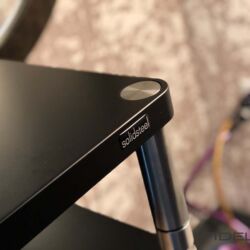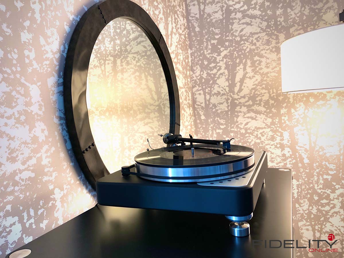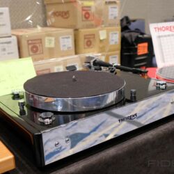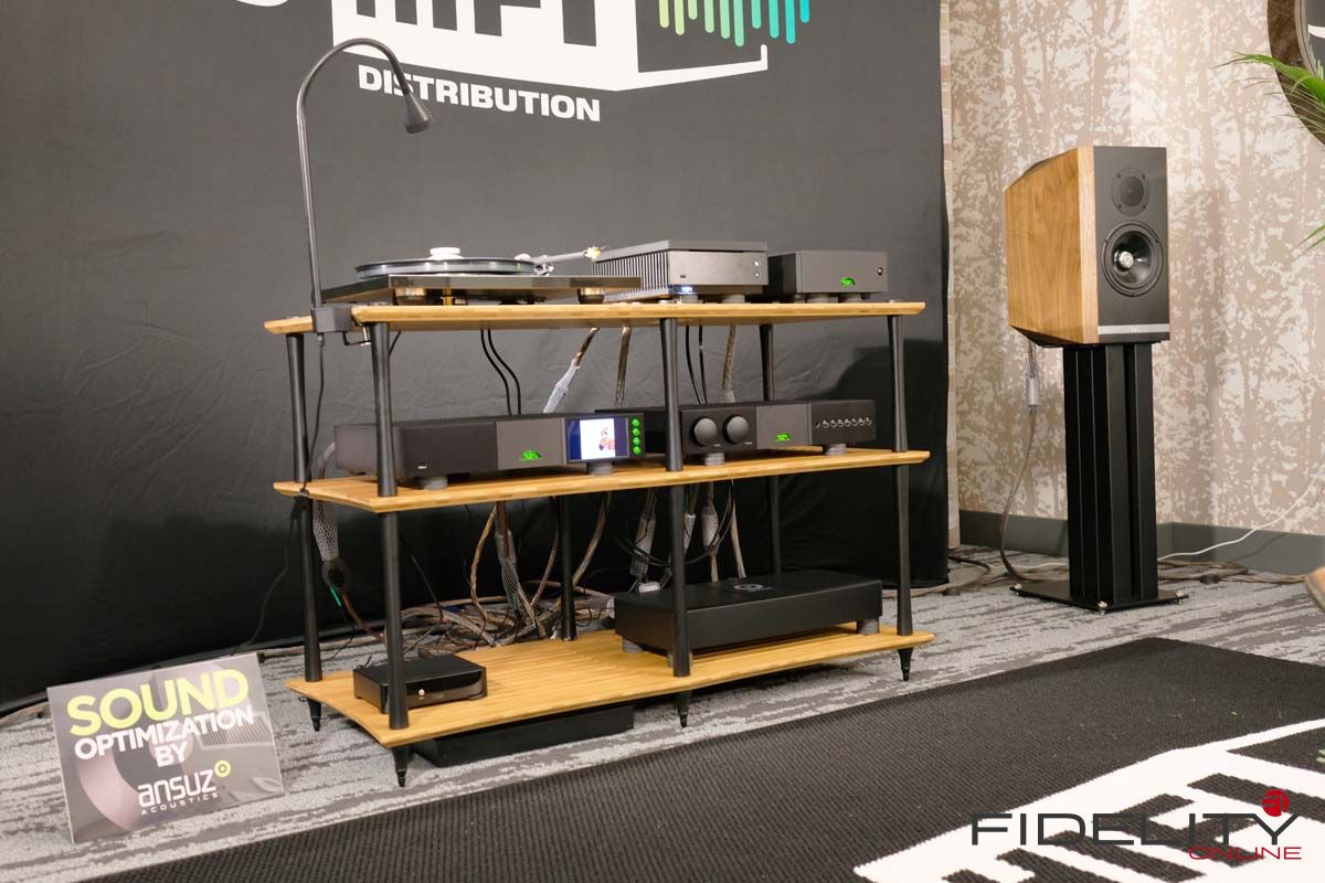 Das ungewöhnlichste Setup, weil eigentlich gar kein Setup, gab es bei Andover Audio zu sehen. Draußen, vor deren Zimmer auf dem Flur ein richtig fetter Sound, ging man rein war nichts zu sehen, außer einem Plattenspieler auf einer Art Rack, sonst nichts. Die Lösung: Das Rack war der eigentliche Lautsprecher. Oben ein Rundum-Array und unten ein Subwoofer. Ob es eine gute Idee ist einen Plattenspieler auf einen Lautsprecher zu stellen bleibt dahingestellt. Funktioniert hat es aber tatsächlich großartig. Der Raum glich einer akustischen Täuschung.