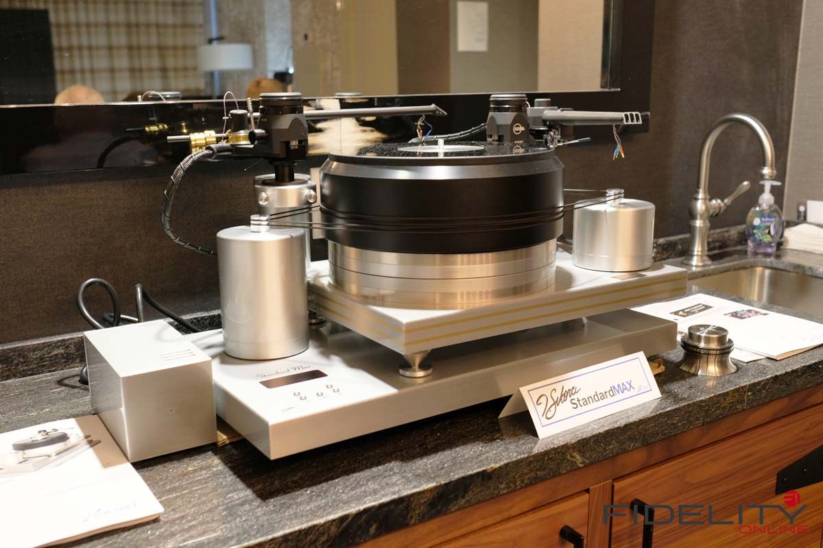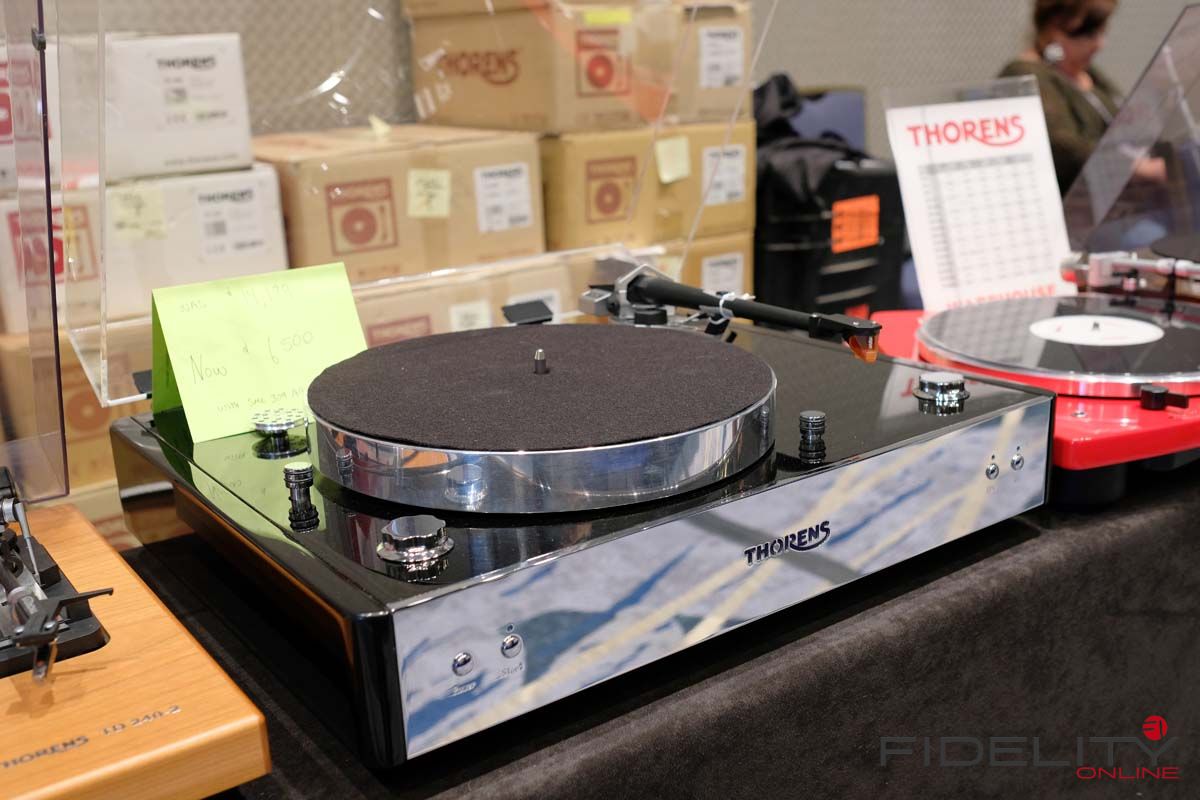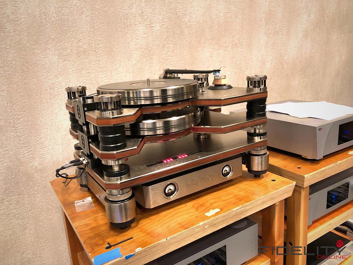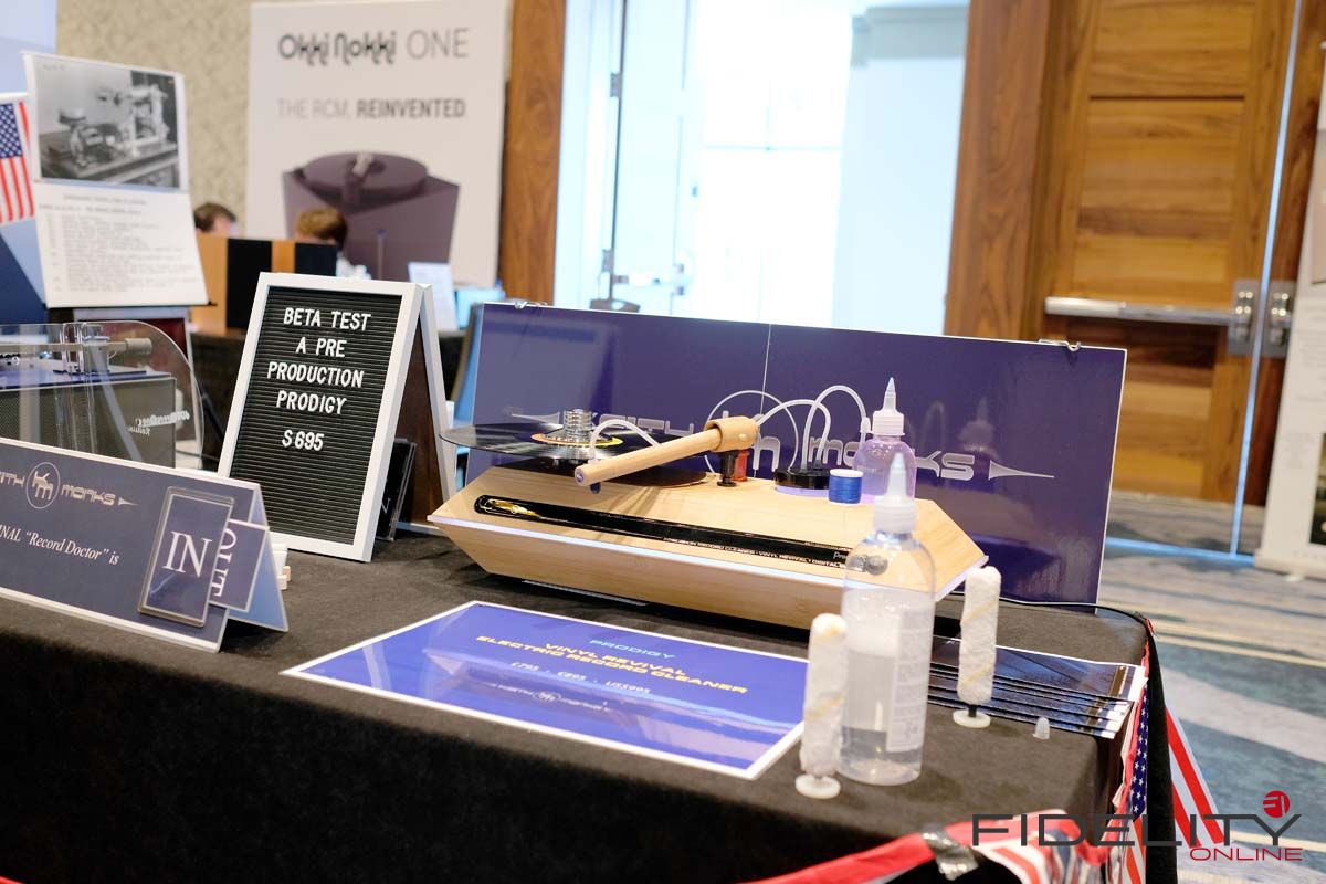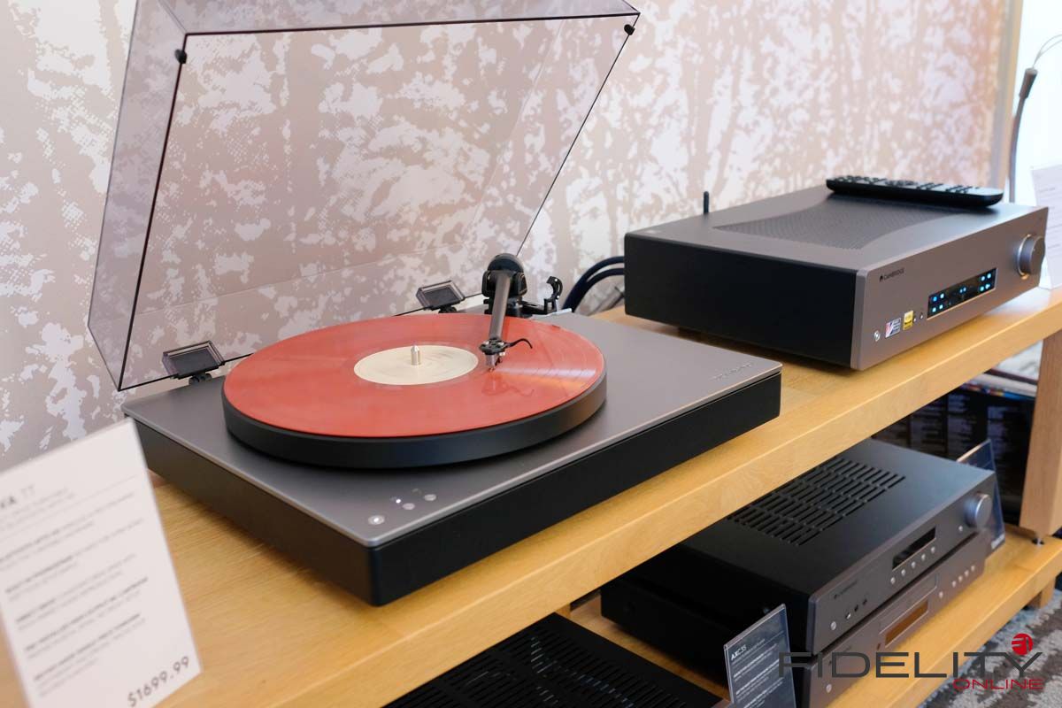 Das ungewöhnlichste Setup, weil eigentlich gar kein Setup, gab es bei Andover Audio zu sehen. Draußen, vor deren Zimmer auf dem Flur ein richtig fetter Sound, ging man rein war nichts zu sehen, außer einem Plattenspieler auf einer Art Rack, sonst nichts. Die Lösung: Das Rack war der eigentliche Lautsprecher. Oben ein Rundum-Array und unten ein Subwoofer. Ob es eine gute Idee ist einen Plattenspieler auf einen Lautsprecher zu stellen bleibt dahingestellt. Funktioniert hat es aber tatsächlich großartig. Der Raum glich einer akustischen Täuschung.