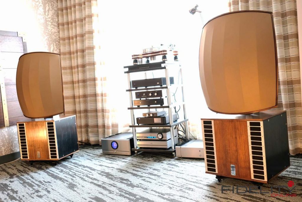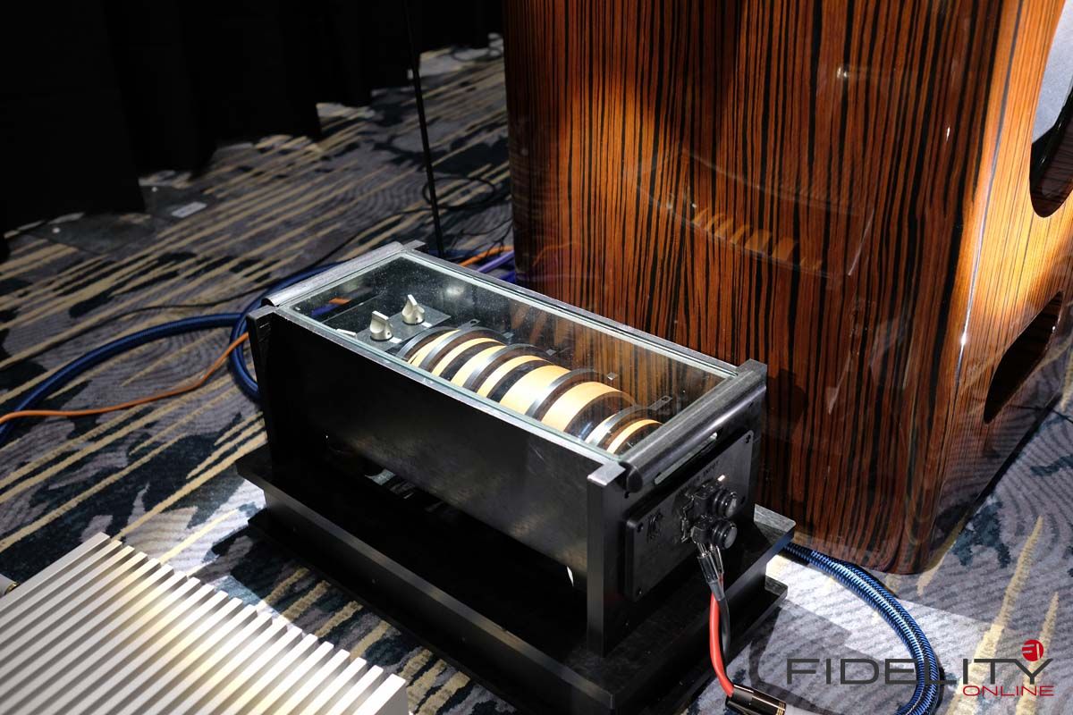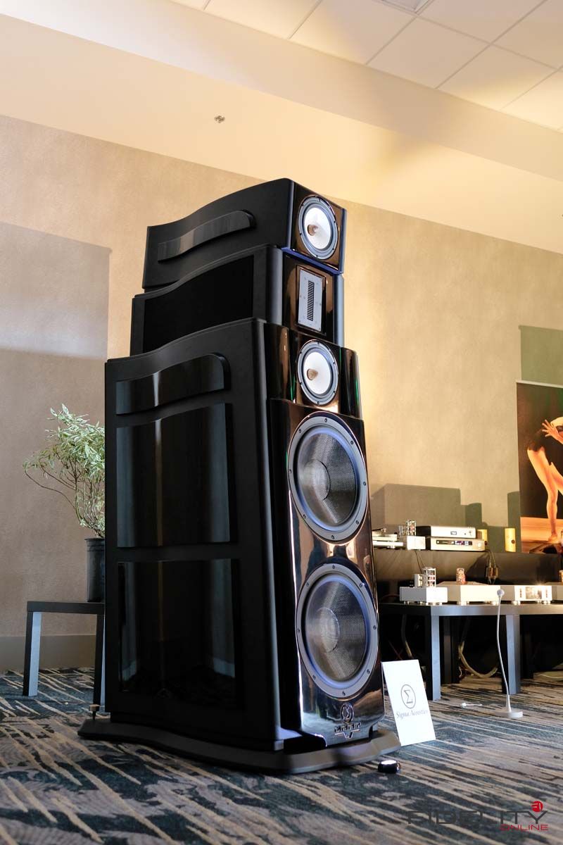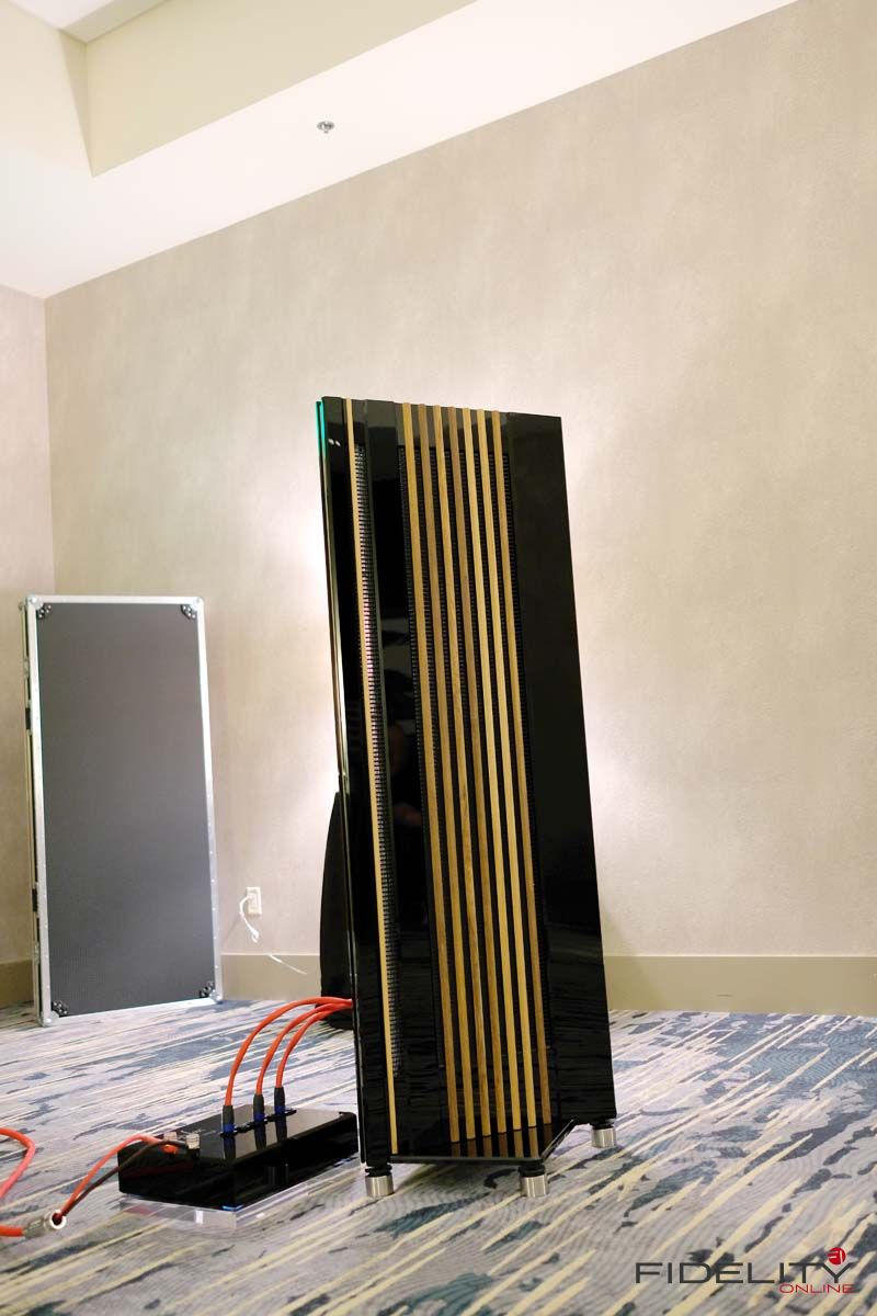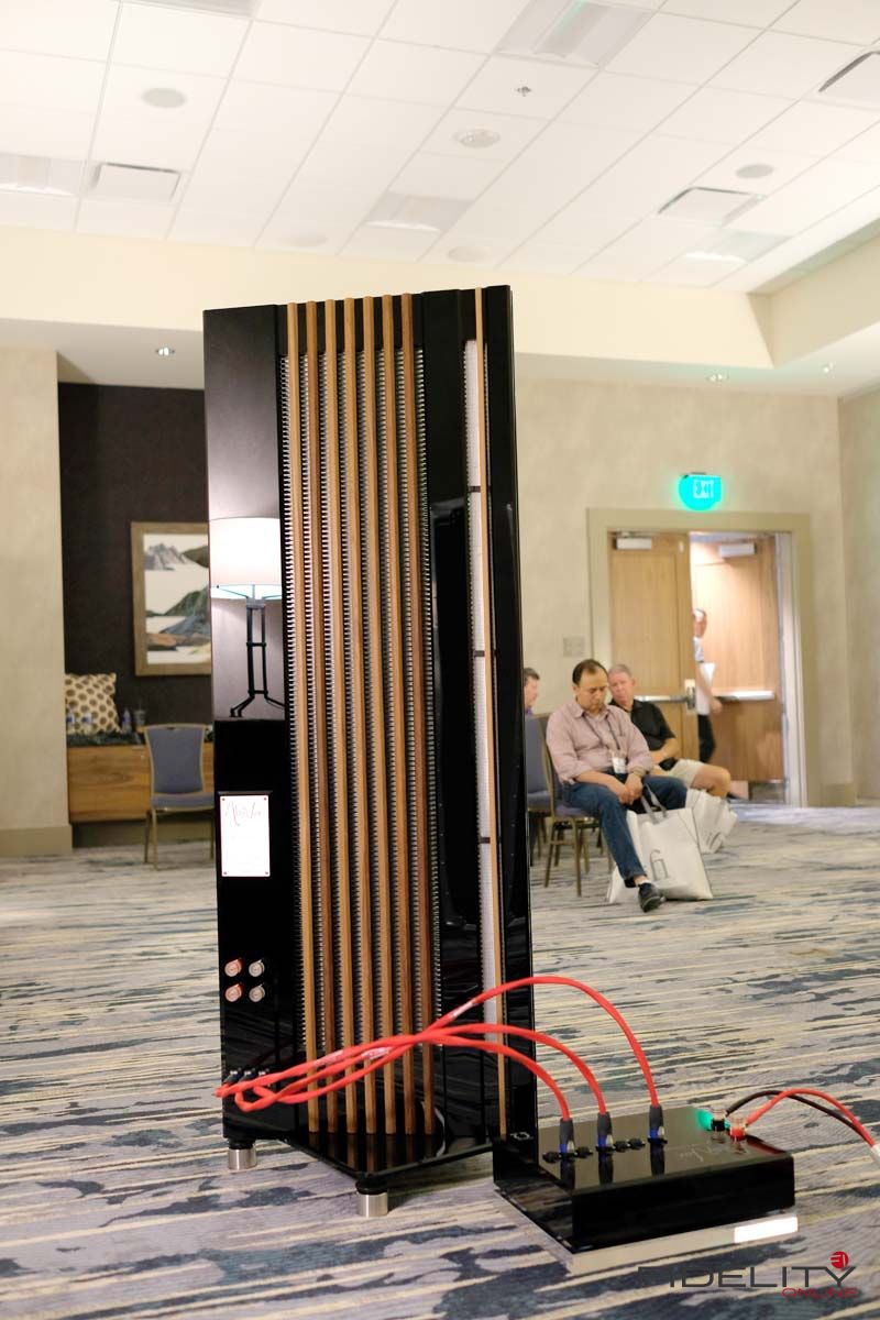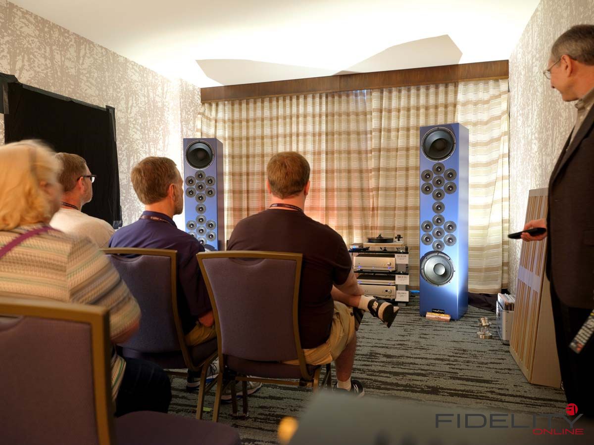 Ein hochgradig interessantes Setup war im Raum von MC Audiotech zu bestaunen. Obgleich das Frontend von Pass sicherlich nicht von schlechten Eltern war, waren es doch die Lautsprecher, die ins Auge stachen. Der Entwickler Paul W. Paddock (Entwickler des einzigartigen Lineum-Treibers und Inhaber von einer Vielzahl von Patenten rund um das Thema Lautsprecher) zeigte dort einen großen Lautsprecher, bestehend aus einem 10-Teiligen Biegewellenwandler-Element in Verbindung mit einem massiven Ripol-Bass. Das System verströmte ein unerwartetes Maß an Leichtigkeit, leistete sich aber kleine Schwächen bei der Abbildung.