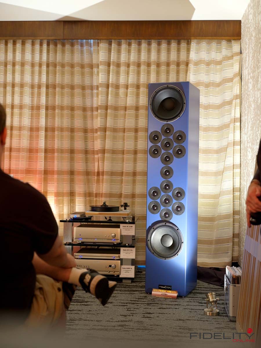 Last but not least gab es einen wirklich interessanten Lautsprecher bei Tekton Design zu sehen (und zu hören). An einem Frontend von Parasound spielte dort etwas, was so aussah, als wäre jemand beim Einbau des Hochtöners durcheinandergekommen. Neben zwei Basslautsprechern waren auf der Front 15 Hochtöner zu sehen?! Des Rätsels Lösung: Jeweils sieben Hochtöner arbeiten in einem kreisförmigen Array oberhalb und unterhalb des eigentlichen Hochtöners als Mitteltöner zusammen. Klingt schräg in der Theorie, hat aber ganz ausgezeichnet funktioniert.