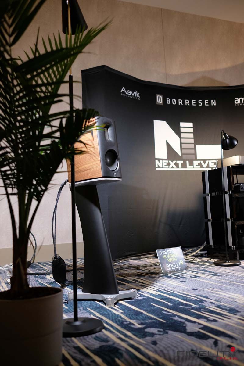 Ein außerordentlich spannendes Setup gab es bei Aavik, Ansuz und Borresen zu hören. Ein für den riesigen Raum, der sicher Platz für mehr als 300 Personen bot, augenscheinlich viel zu kleines Setup mit einem 2-Wege Lautsprecher frei im Raum auf einem Stativ. Jedoch, das was augenscheinlich nicht funktionieren konnte (zu kleiner Lautsprecher in einem viel zu großen Raum), klang ganz hervorragend. Dieses Phänomen hat uns während der Messe tatsächlich immer wieder beschäftigt und wir habe keinen Reim darauf gefunden. Desshalb wollen wir versuchen, den Dingen auf den Grund gehen.