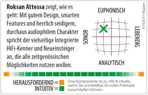 Ohne den System-Gedanken kann man ein Produkt wie den Attessa-Verstärker kaum verstehen, obwohl er natürlich schon allein in jeder Umgebung eine gute Figur machen würde. Wie heute üblich verbirgt dieser Verstärker seine umfangreichen Möglichkeiten hinter einem ästhetischen Design. Die Entwickler haben keine Mühen gescheut, den Verstärker äußerlich so konsequent wie möglich von allen überflüssigen Bedienelementen zu befreien. Übrig bleibt eine edle silbergraue Front am extrem flachen Gehäuse mit einem einzigen großen Regler, der geschmeidig und weich agiert. Hinter einer schwarzen verspiegelten Leiste erscheinen nach dem Einschalten Quellenwahlsymbole und Lautstärkeraster in dezentem Orange. Links und rechts außen liegen der Netzschalter und der Kopfhörerausgang (Stereo-Miniklinke). Schlichter geht es kaum. Und auch nicht eleganter, denn dieser Verstärker fügt sich perfekt in die aktuelle Smartproduktpalette hochwertiger Hersteller. Im Sideboard unter dem Flachbildfernseher etwa könnte man annehmen, dass der Verstärker zum TV gehört. Im modernen Wohnambiente, in dem Schlichtheit und Eleganz regieren, wirkt die Roksan-Anlage wie ein bewusst gewähltes Accessoire.